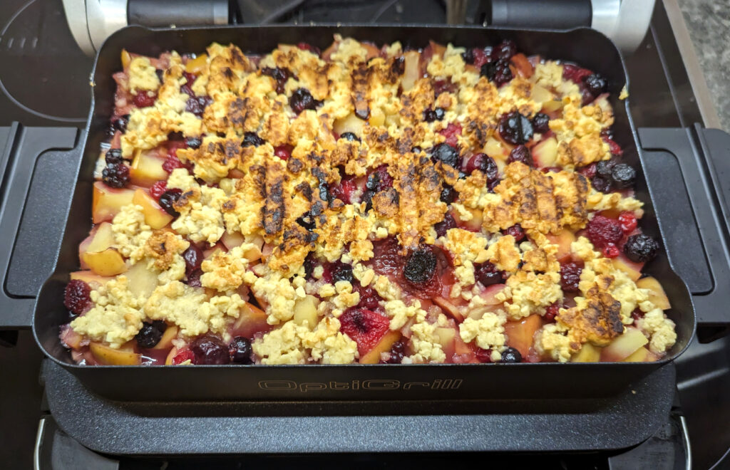 Den „Backofen“ testen wir mit einem Himbeer-Erdbeer-Crumble. Hierzu nutzen wir die im Rezept vorgeschlagene Anleitung. Auch wenn die Menge und das Verhältnis der Personenanzahl wie erwähnt wenig Sinn macht, überzeugt uns das Ergebnis. Zum Start bereiten wir den Teig nach vorhandener Anleitung zu und können den vorgeschlagenen Temperaturbereich über das mehrfache Drücken der Taste für den manuellen Modus auswählen. Nachdem die Backform eingesetzt ist, startet der Druck auf die OK-Taste die Zubereitung. Nach der angegebenen Zeit von 20 Minuten kann sich das Ergebnis sehen lassen. Die Hitzeverteilung ist gleichmäßig und sorgt dafür, dass der Backprozess vollständig abgeschlossen ist. Dies geht auch in einem Backofen nicht schneller – sehr gut.