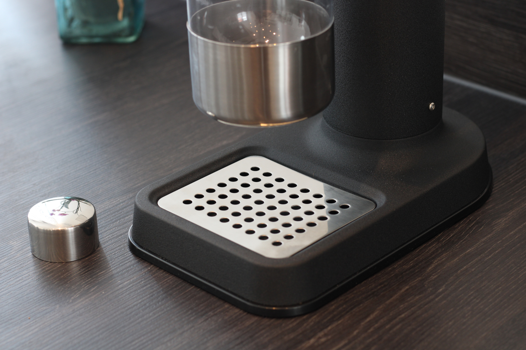 Das Aufsprudeln über den Metallhebel auf der rechten Seite funktioniert dagegen wunderbar einfach. Das Element hat aus unserer Sicht den richtigen Widerstand und geht nach dem Loslassen automatisch in die Ausgangsposition zurück. Allerdings lässt sich der Hebel auch noch verwenden, wenn keine Flasche eingehängt ist. Hier hätten wir uns eventuell noch einen Sperrmechanismus gewünscht.