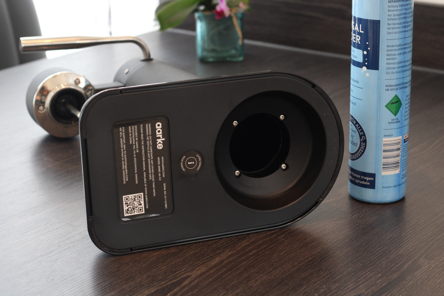 Der Aarke Carbonator 3 kommt komplett montiert bei den Käuferinnen und Käufern an. Einzig das Abtropfgitter müssen sie noch auf die entsprechende Schale im Standfuß legen. Danach müssen sie noch einen CO₂-Zylinder auf der Unterseite eindrehen und das Sprudeln kann beginnen. Unverständlicherweise legt Aarke aber keine Kartusche bei, was wir gerade in Anbetracht des hohen Preises nicht nachvollziehen können. Bei allen bisher von uns getesteten Sprudlern befindet sich ein Zylinder im Lieferumfang, teils bei einem deutlich günstigeren Einstiegspreis. Immerhin unterstützt der Carbonator 3 alle gängigen Modelle von 425 Gramm und 60 Litern.