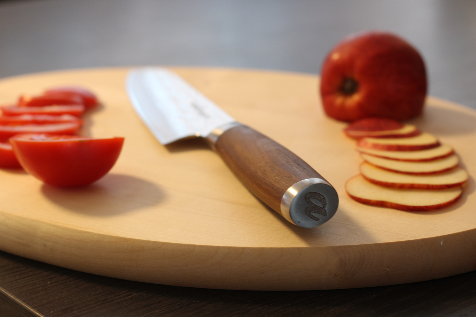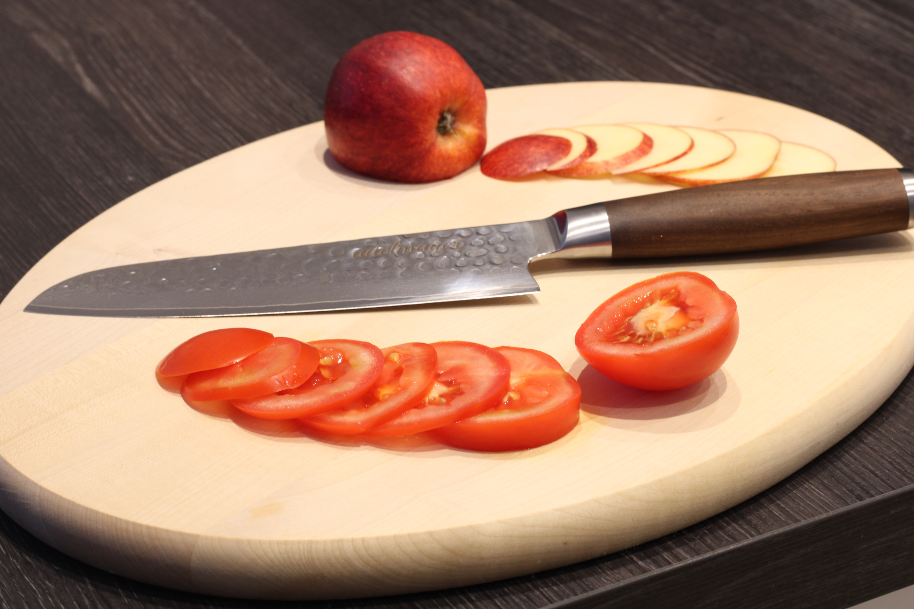 adelmayer Damastmesser Santokumesser 17,5 cm Gesamtansicht auf Schneidbrett mit geschnittener Tomate und geschnittenem Apfel