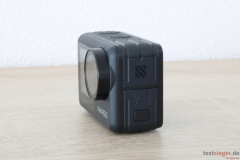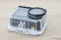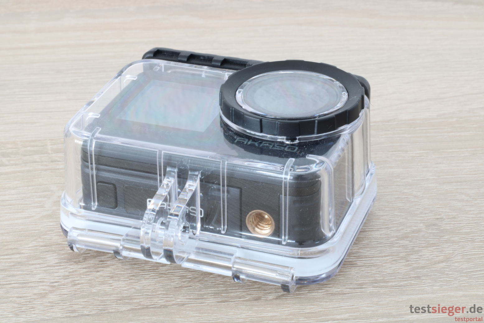 Die Verarbeitung des Gehäuses geht insgesamt in Ordnung. Allerdings entdecken wir ein paar unsaubere Übergänge zwischen den einzelnen Komponenten und das ein oder andere zu große Spaltmaß. Außerdem schließt die Abdeckung des Akkufachs nicht bündig ab. Der verwendete Kunststoff ist jedoch angenehm robust, damit dürfte zumindest das Innenleben auch unsanftere Stürze überstehen. Für die Linse und die beiden Displays würden wir jedoch nicht die Hand ins Feuer legen. Wer auf Nummer Sicher gehen möchte, verwendet das Schutzgehäuse. Hier gibt es in puncto Verarbeitung nichts auszusetzen. Das Einlegen der Cam und das Schließen über das große Scharnier an der Oberseite klappt problemlos. Ob die Hülle die von Akaso versprochenen 40 Meter-Tauchgänge übersteht, können wir nicht überprüfen. Unsere Wasser-Ausflüge waren jedoch allesamt kein Problem.
