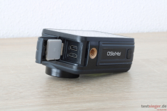 Video und Fotos speichert die Action-Cam auf MicroSD-Karten. Hier muss der Nutzer jedoch noch einmal zusätzlich Geld in die Hand nehmen, da keine beiliegt. Der entsprechende Slot befindet sich neben dem Akkuschacht auf der Unterseite. Das Einlegen und Herausnehmen ist jedoch recht fummelig. Da die Akaso ohne Schutzgehäuse bis zu einem Meter wasserdicht ist, liegen Akku und auch alle anderen Anschlüsse unter Schutzklappen verborgen. Zum Öffnen muss der Nutzer den entsprechenden Knopf drücken und die Abdeckung etwas nach vorne schieben. In der Praxis öffnen sich die Klappen jedoch nur sehr schwergängig. Gerade beim Verschluss des MicroUSB- und MiniHDMI-Anschluss ist eine echte Kraftanstrengung nötig. Sehr praktisch ist das zweite Display an der Vorderseite für Selfie-Aufnahmen. Durch zweisekündiges Drücken der Modus-Taste schaltet der Nutzer zwischen den beiden Bildschirmen um. An der Unterseite befindet sich ein Stativgewinde für verwacklungsfreie Aufnahmen.