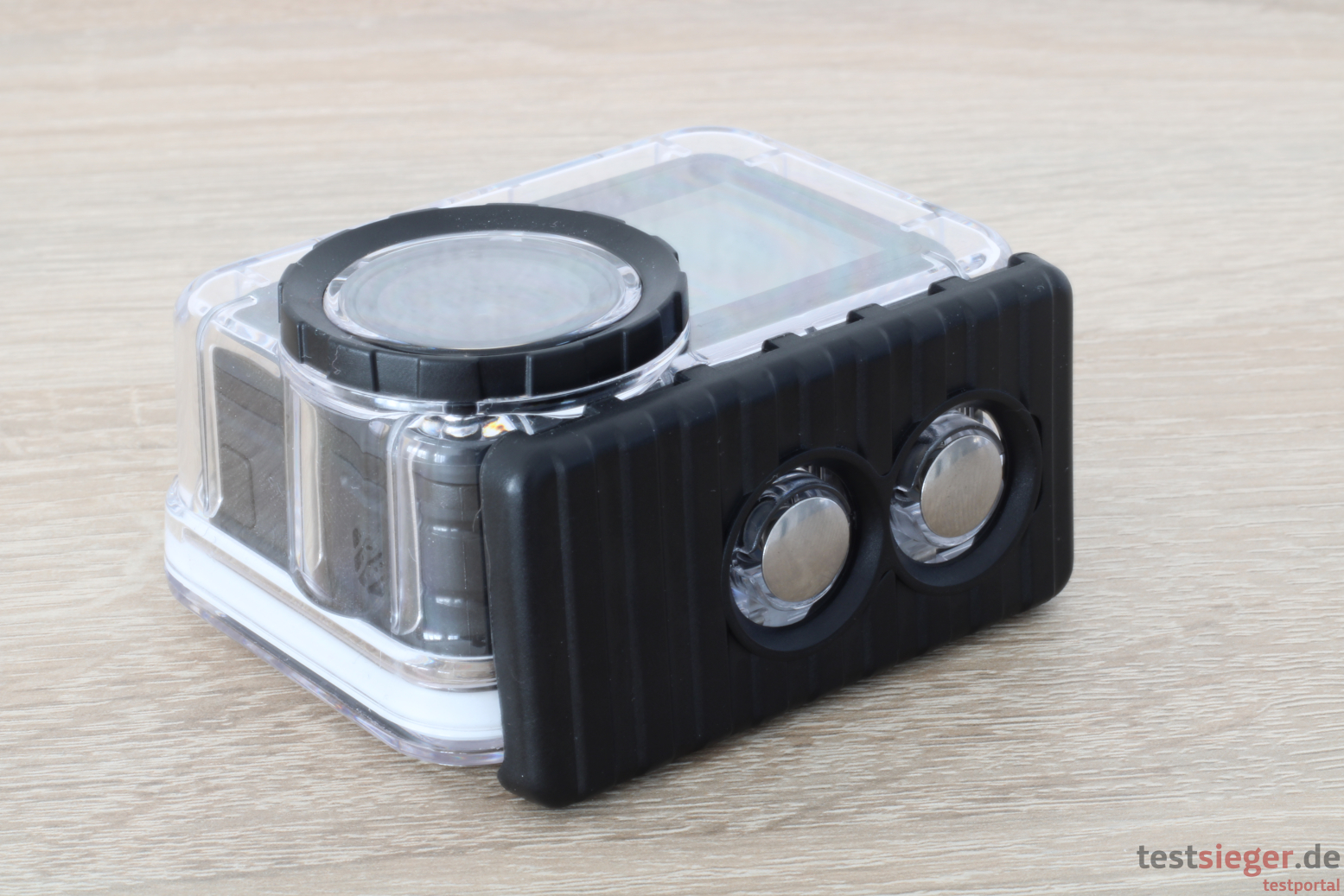 Etwas unverständlich: Viele Funktionen wie die Loop-Aufnahme, Zeitraffer oder Zeitlupe sind nicht in den Einstellungen zu finden. Diese öffnen sich durch Druck auf die Auflösungsanzeige des Touchscreens. Wer die Fotoqualität anpassen möchte, muss noch einen dritten Weg gehen. Durch zweimaligen Druck auf die Modus-Taste gelangt der Nutzer in ein weiteres Menü mit den Unterpunkten: Wiedergabe, Videoeinstellungen und den Fotoeinstellungen. Warum Akaso nicht alle Punkte zusammenfasst ist unverständlich. Somit wirkt das Bedienkonzept insgesamt wenig durchdacht und es bedarf viel Übung. Da keine gedruckte Anleitung beiliegt, bleibt nur ausprobieren oder dem QR-Code zum ausführlichen digitalen Begleitheft zu folgen. Ein weiterer Negativpunkt: Wer das wasserfeste Gehäuse verwendet, muss natürlich ohne Touchscreen auskommen. Doch nicht alle Menüpunkte lassen sich über die Tasten erreichen. Die Knöpfe am Schutzgehäuse sind recht hart gefedert. Somit besteht nicht die Gefahr, dass der Nutzer während Action-Aufnahmen ungewollt Eingaben tätigt.