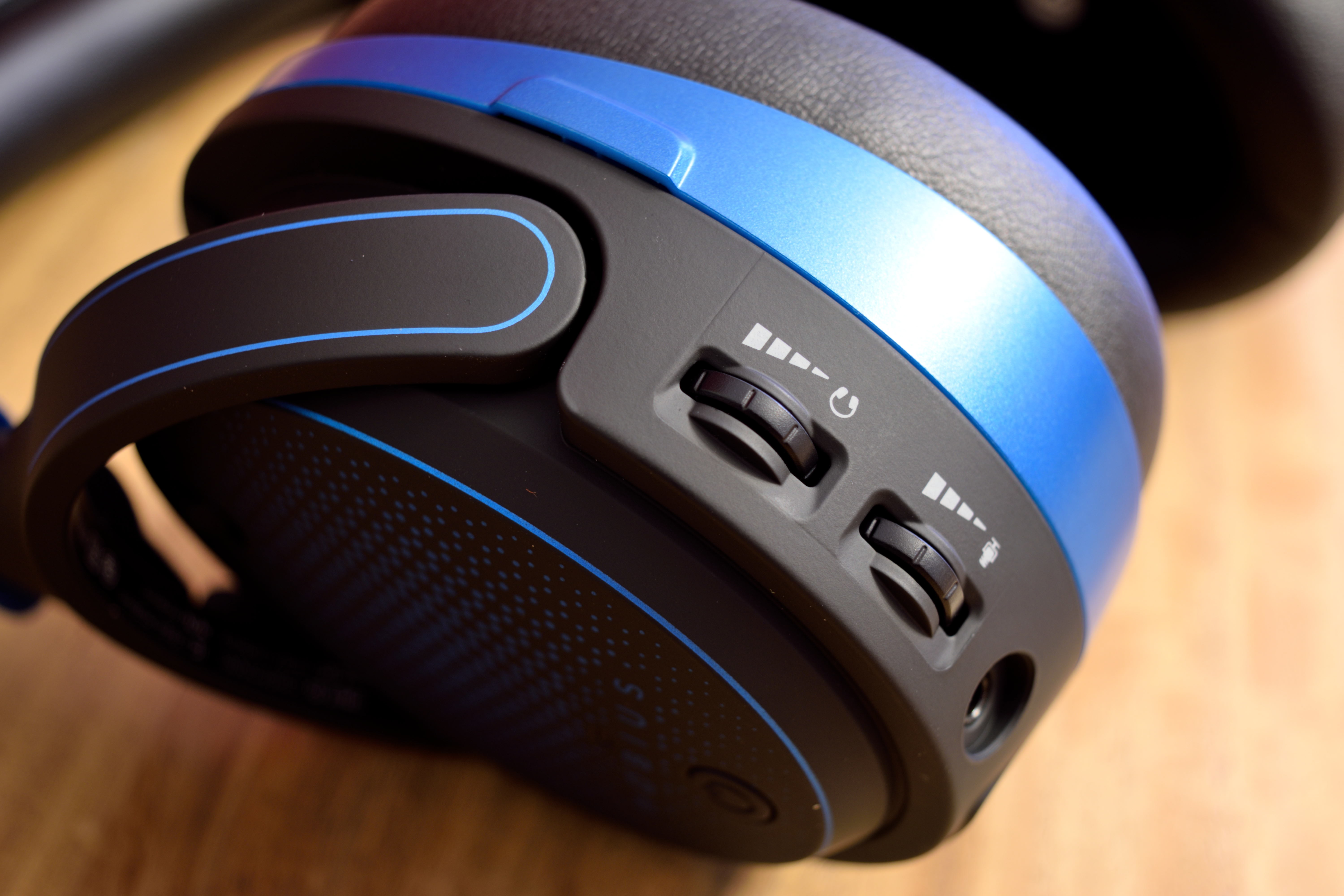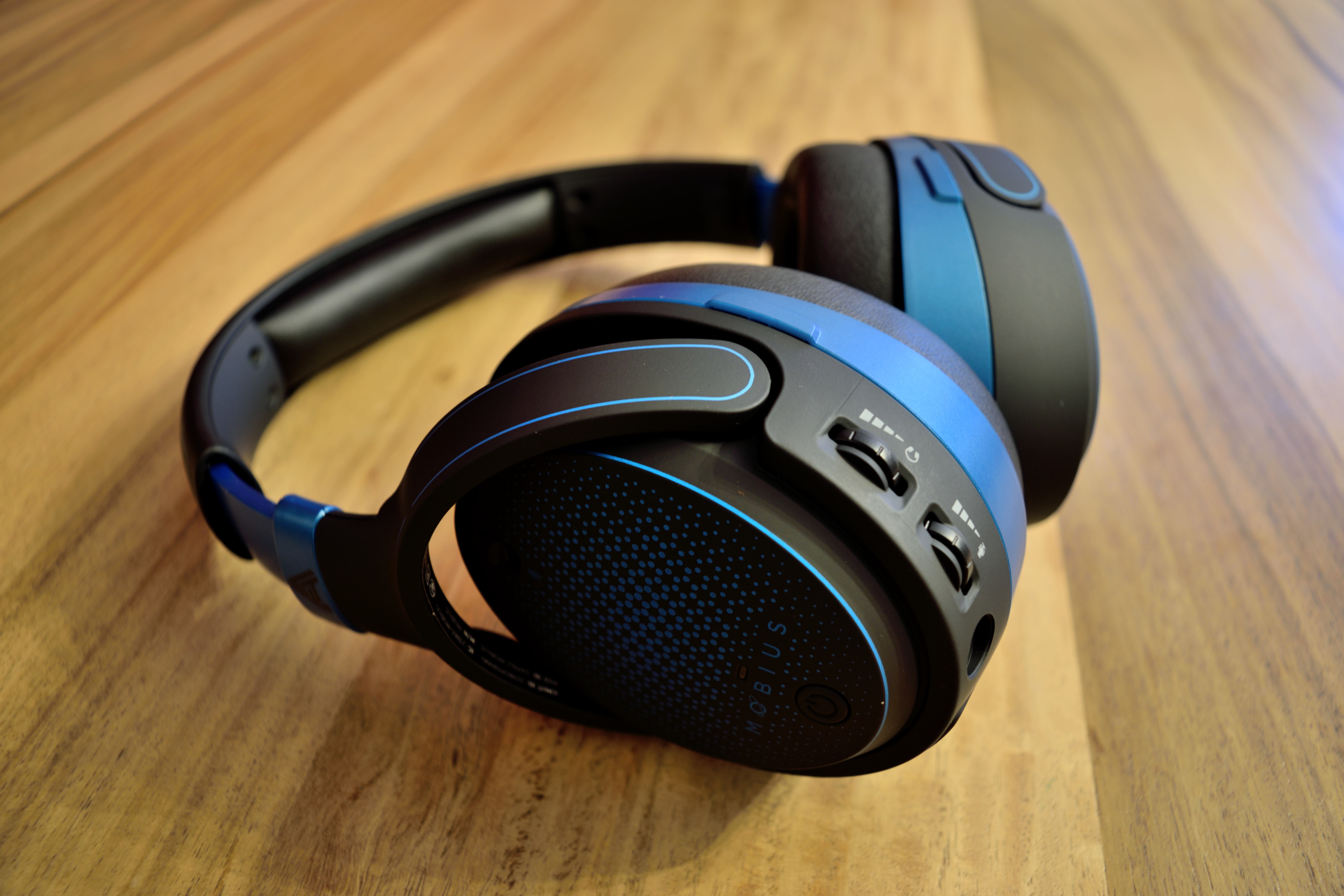 Achtung, es wird etwas komplizierter! Die Bedienung des Mobius erfolgt über zwei Räder, zwei Tasten und einen Schiebeschalter an der linken Ohrenschale. Selbsterklärend sind die beiden Regler für die Wiedergabe- und die Mikrofonlautstärke. Der Schieberegler schaltet das Mikrofon bei Bedarf stumm und wieder aktiv. Die 3D-Taste und der Power-Button sind jedoch mit drei beziehungsweise vier Funktionen belegt – und die beiden Drehregler können ebenfalls durch Drücken zwei weitere Funktionen auslösen.