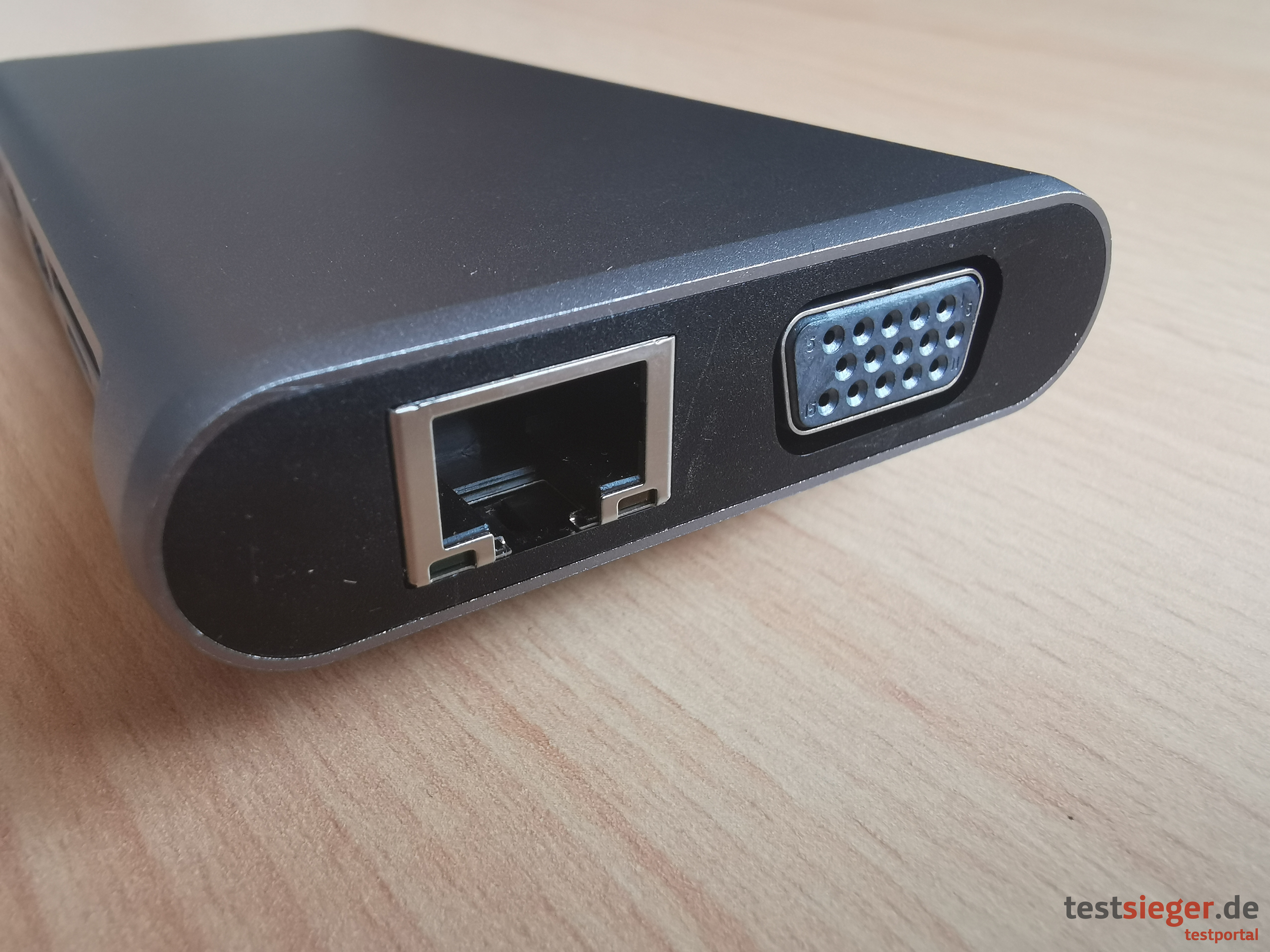 Last but not least gibt es die beiden Anschlüsse auf der kurzen Kante des Hubs. Dort befinden sich ein Gigabit-Ethernet-Anschluss und ein VGA-Anschluss. Insgesamt umfasst der Hub ein durchaus umfangreiches Angebot an Anschlüssen. Von den wichtigsten und wohl am häufigsten benutzten Anschlüssen (USB 2.0, USB 3.0 und HDMI) sind jeweils zwei vorhanden. Einziger Kritikpunkt hierbei ist das Fehlen eines Kopfhörer- oder Mikrofonanschlusses.
