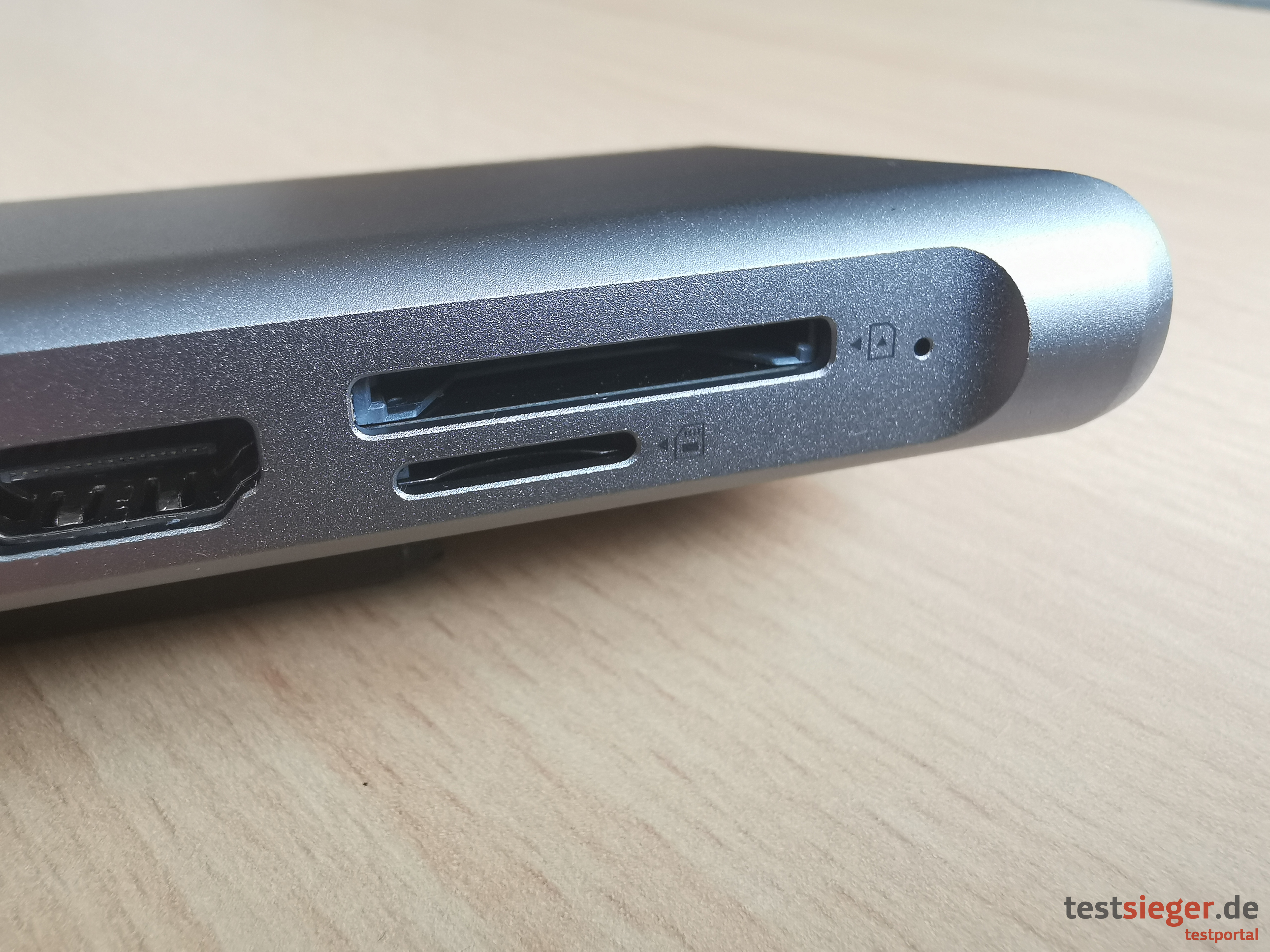Sämtliche Anschlüsse sind sauber gearbeitet, störende Übergänge zwischen dem Gehäuse und den einzelnen Anschlusselementen fallen uns nicht auf. Fingerabdrücke hinterlassen auf der Oberfläche des Hubs keine Spuren, jedoch könnte die Aluminiumlegierung anfällig für Kratzer sein. Der Lieferumfang umfasst keine Transporthülle, was besonders bei der Größe und der Anfälligkeit für Kratzer wünschenswert gewesen wäre. Alles in allem vermittelt der USB-C Hub einen kompakten und wertigen Eindruck.