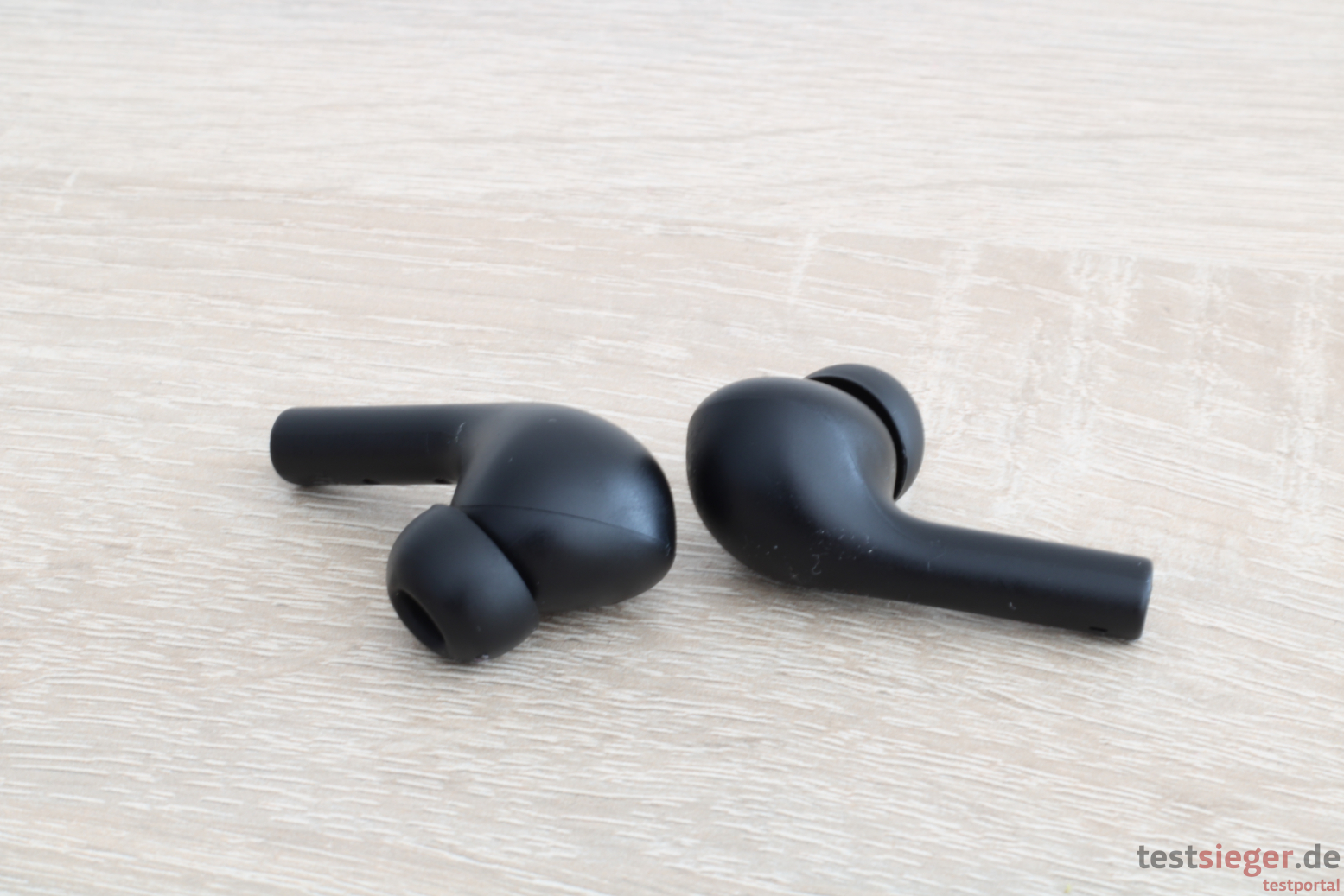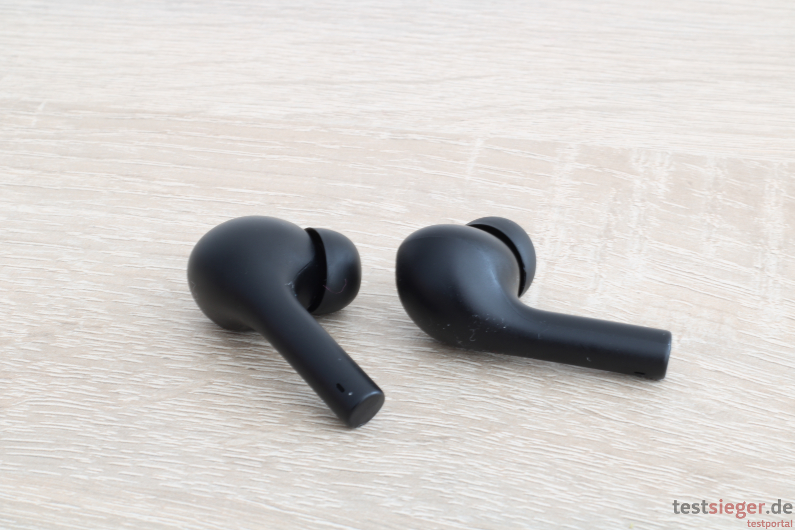 In puncto Design verwendet Aukey die Stabbauweise. Dementsprechend erinnern die EP-T21S etwas an die Apple AirPods, sind jedoch weit genug entfernt, um nicht als Kopie durchzugehen. Allein die schwarze Farbgebung bietet schon eine ausreichende Differenzierung. Mit Abmessungen von 4,2 Zentimetern in der Höhe, 1,9 Zentimetern in der Breite und knapp 2,5 Zentimetern in der Tiefe liegen die Abmessungen absolut im Rahmen. Aufgrund des recht großen knubbeligen Hörers sind sie jedoch jederzeit deutlich im Ohr sichtbar. Die Stiele eignen sich hervorragend, um die Aukey ins Ohr zu setzen und wieder herauszunehmen. Hier muss der Nutzer keine Angst haben, versehentlich Eingaben an der berührungsempfindlichen Rückseite zu tätigen.