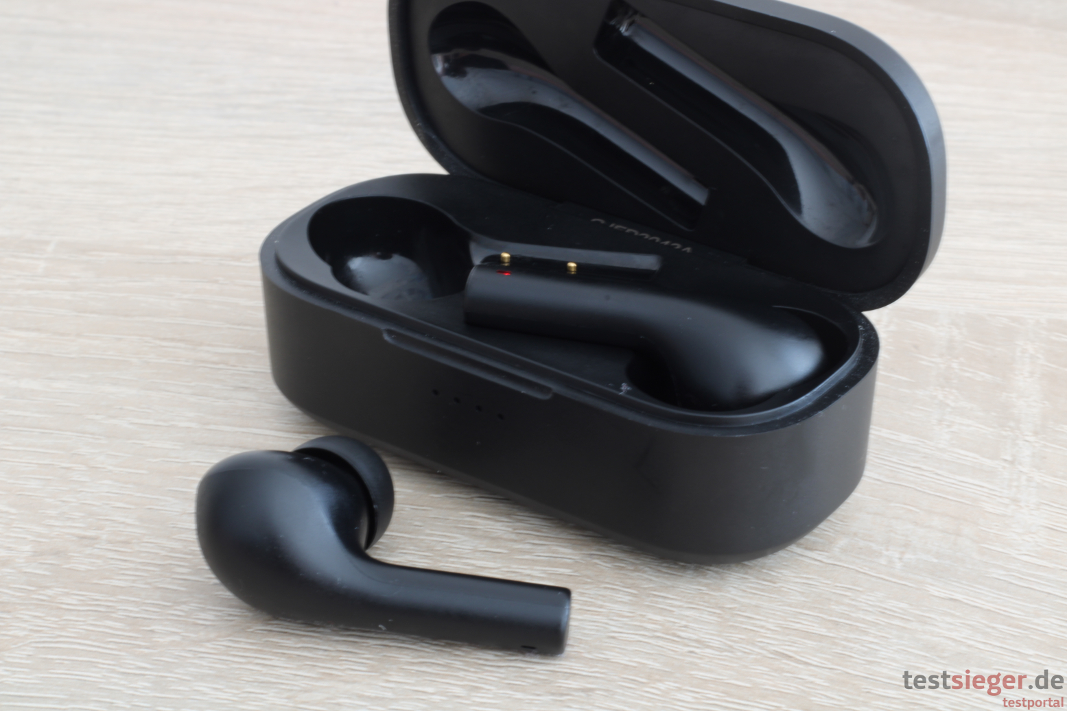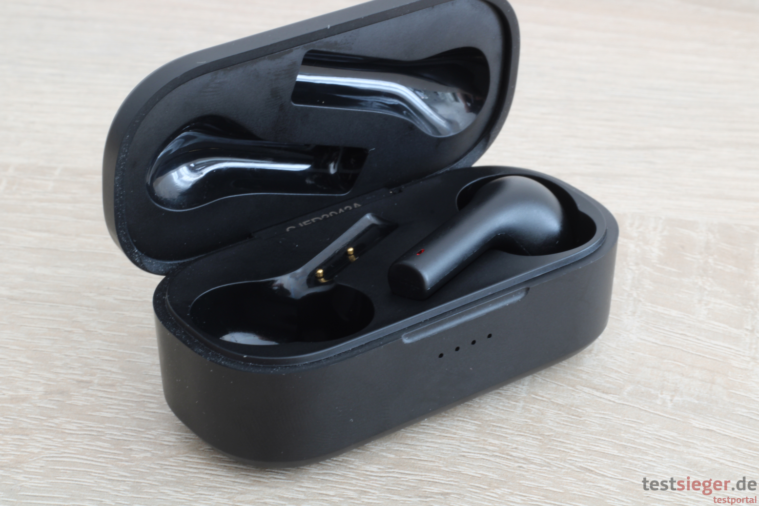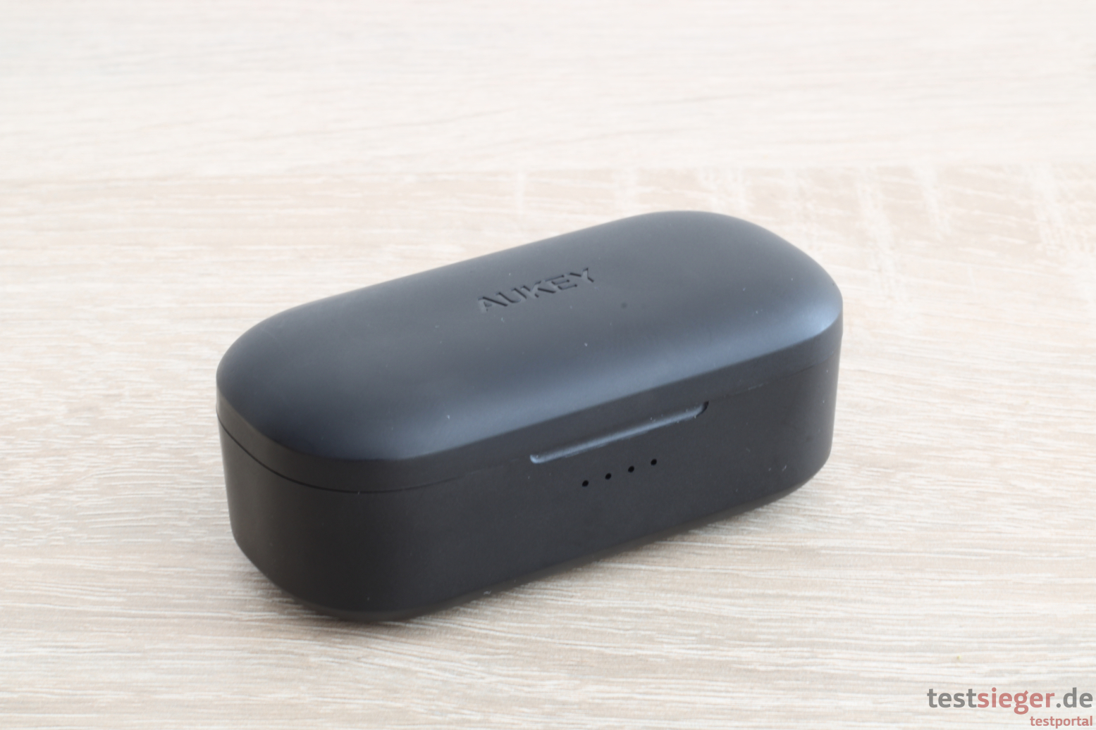 Bluetooth liegt in der aktuellen Version 5.0 vor. An der Verbindungsqualität haben wir nichts auszusetzen. Selbst auf eine Entfernung von 8 Metern durch zwei Wände, stellen wir keine Abbrüche fest. Auf freier Fläche dürfte die Verbindung sogar noch weiter stabil bleiben. Um die Kopfhörer mit anderen Bluetooth-tauglichen Geräten zu verbinden, einfach die Klappe des Ladecases öffnen. Dann gehen die Kopfhörer automatisch in den Pairing-Modus über. Eine aktive Geräuschunterdrückung hat sich Aukey gespart, was aufgrund des niedrigen Preises aber auch nicht zu erwarten war. Da die Kopfhörer das Ohr gut abdichten, gelangen beim Musikhören, wenn überhaupt, nur sehr abgedämpfte Geräusche durch.