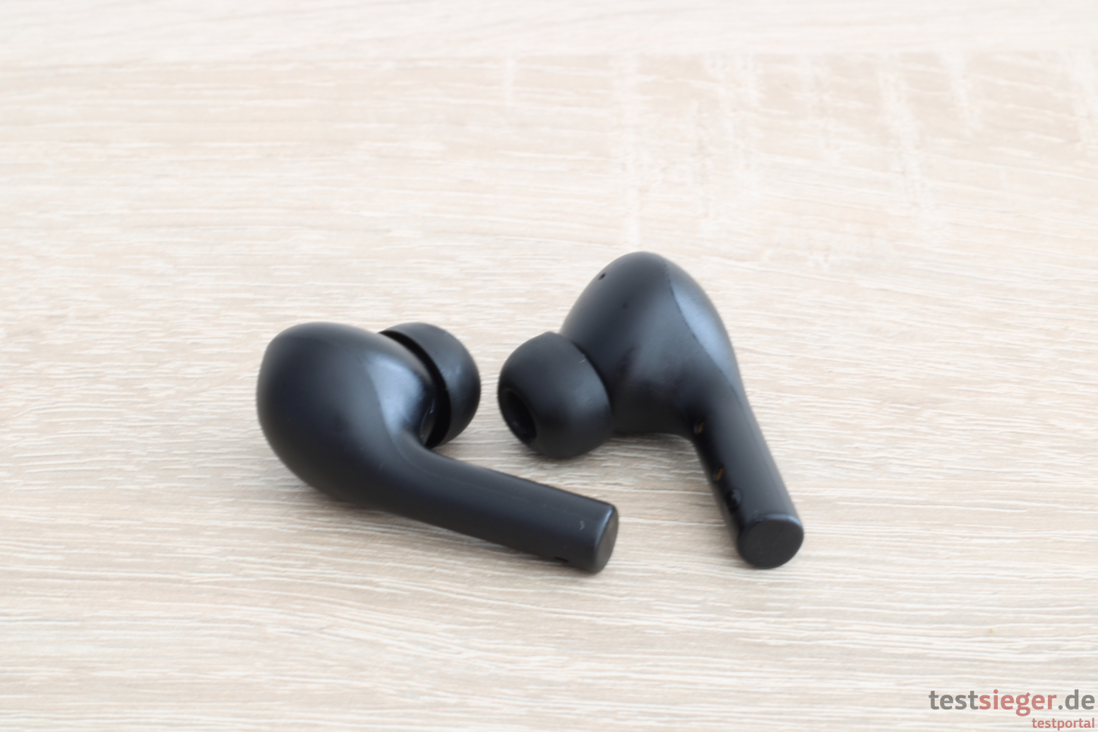 Die Aukey EP-T21S sind recht leicht. Das Gewicht von 4 Gramm pro Kopfhörer steht dem Tragekomfort nicht im Weg. Da die Hörer fest im Gehörgang sitzen, spüren wir sie zwar konstant, allerdings über die meiste Zeit nicht unangenehm. Erst nach längerer Verwendung können sie etwas drücken. Damit jeder Nutzer die passende Größe findet, befinden sich drei paar Silikonpolster im Lieferumfang. Selbst bei sehr ruckartigen oder schnellen Bewegungen sitzen sie fest. Der Verwender muss also keine Angst haben, dass die Stöpsel herausfallen. Definitiv eine Verbesserung zu den Vorgängern, die uns hin und wieder hausgepurzelt sind. Dank IPX6-Spritzwasserschutz überstehen die True-Wireless-Kopfhörer auch schweißtreibende Tätigkeiten oder einsetzende Regenschauer unbeschadet.