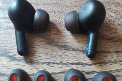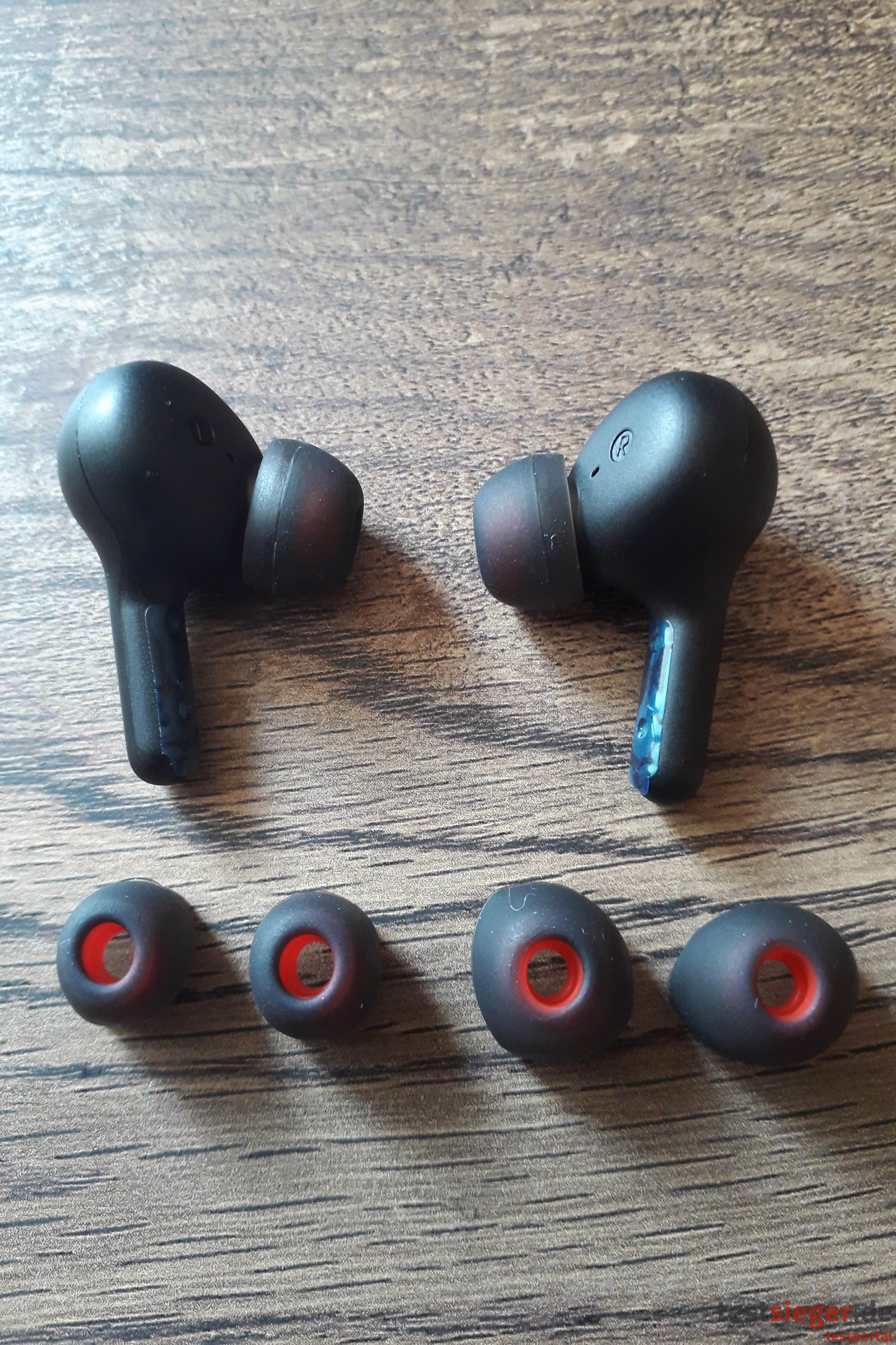 Mit ihrem schlichten Design aus schwarzem Kunststoff sind die Earbuds zwar kein optisches Highlight, passen sich jedoch überall ein. Die Kopfhörer verfügen über äußerst geringe Spaltmaße und sind insgesamt ordentlich verarbeitet. Die grauroten Ohrstöpsel sitzen stabil auf den Kopfhörern und erweisen sich als sehr weich und nachgiebig. Ebenfalls im Lieferumfang enthalten ist ein Hartschalenetui, das gleichzeitig als Ladecase fungiert. Dieses ist zweckmäßig konstruiert, der Deckel sitzt etwas locker. Damit alles an der korrekten Position landet, sind die Nischen für den linken sowie den rechten Kopfhörer eindeutig gekennzeichnet, Magnete halten die Earbuds an Ort und Stelle. Außen zeigen vier blaue LEDs den Ladestand des Case an.
