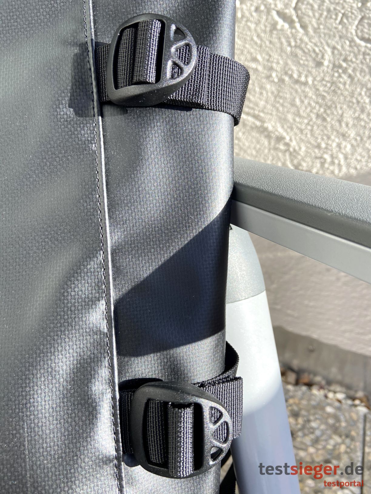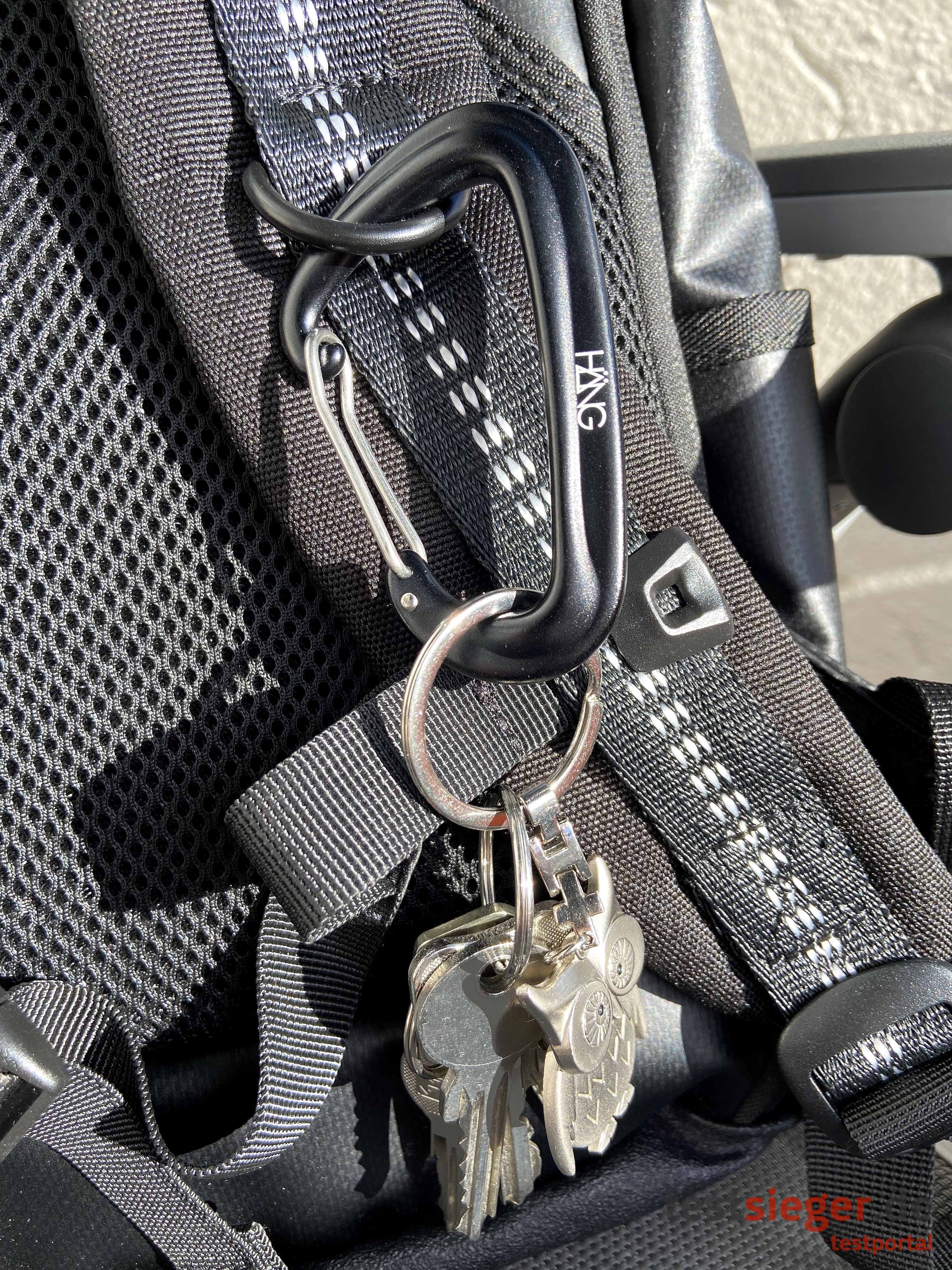 Neben dem Rucksack selbst ist ein Karabinerhaken aus Aluminium (Gewicht: 21 Gramm) mitgeliefert, den wir an den beiden kleinen Ösen an den Schultergurten befestigen. So haben wir unseren Schlüssel jederzeit parat. Auf der Vorderseite bietet der BÄG mit einem länglichen Fach Platz für das Smartphone. Der Reißverschluss an dieser Stelle ist so konzipiert, dass kein Wasser eindringen kann. Bei unserem Test stellen wir aber fest, dass ein wenig Wasser bei direktem, starkem Wasserstrahl eindringt. In eine tiefe Pfütze sollte man den Rucksack daher lieber nicht stellen oder Starkregen aussetzen. Bei weiteren Wassertests schneidet der Rucksack prinzipiell gut ab. Bei unserem Testprodukt fällt uns aber eine schwerwiegende Kleinigkeit auf: An einer Stelle geht die Naht, die die Unterseite mit der LKW-Plane verbindet, während des Tests auf. Auch wenn es sich hierbei nur um eine winzige Stelle handelt, dringen bereits kleinste Wassermengen in das Innere des Rucksacks.