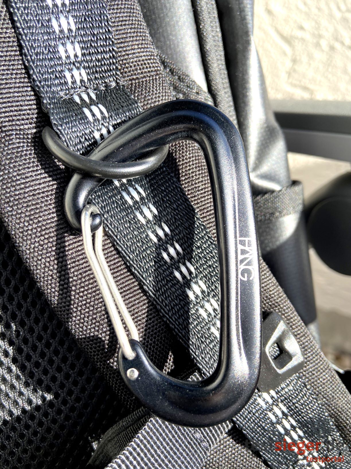 Die Weite der Schultergurte justieren wir schnell nach, auch wenn wir den Rucksack bereits tragen. Auch bei hohem Gewicht auf den Schultern passen wir die Gurte problemlos an. Ein zusätzlich angebrachter Brustgurt trägt deutlich zum Tragegefühl und zur Sicherheit bei. Bei schwerem Inhalt nimmt dieser zusätzliche Gurt deutlich das Gewicht von den Schultern. Ein Gummizug am hinteren Ende bietet zusätzlichen Spielraum für Flexibilität. Außerdem lässt sich der Gurt je nach Belieben am Schultergurt frei anbringen oder komplett abnehmen.