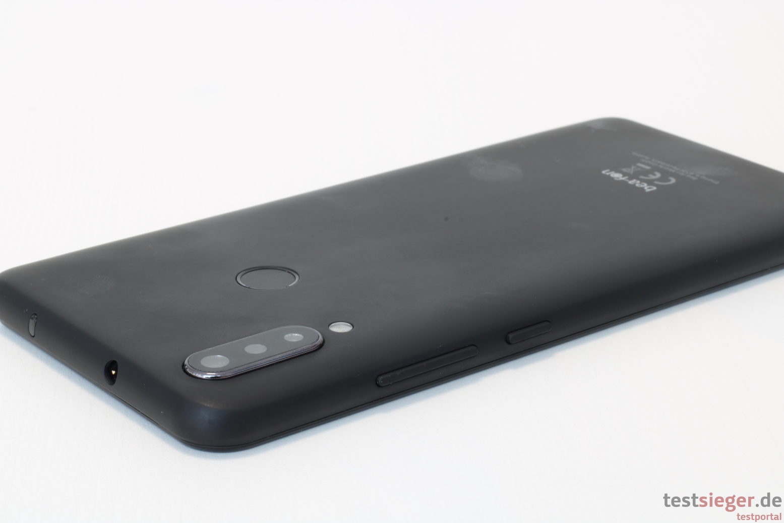 Die Frontkamera sitzt in einer Wassertropfen-Notch im oberen Rand des Displays. Dementsprechend benötigt das Bea-fon keinen ausladenden Rahmen, bis zu den Rändern erstreckt sich der Bildschirm jedoch nicht. An der Oberseite liegt die Umrandung mit 4 Millimetern absolut im Rahmen. An den Seiten ist der Rahmen mit 3 Millimetern noch etwas schmaler, am unteren Rand ist er mit 8 Millimetern am ausgeprägtesten. Auf der Rückseite sticht vor allem die leicht aus dem Gehäuse tretende Dual-Kamera hervor. Außerdem befindet sich hier der Fingerabdrucksensor.