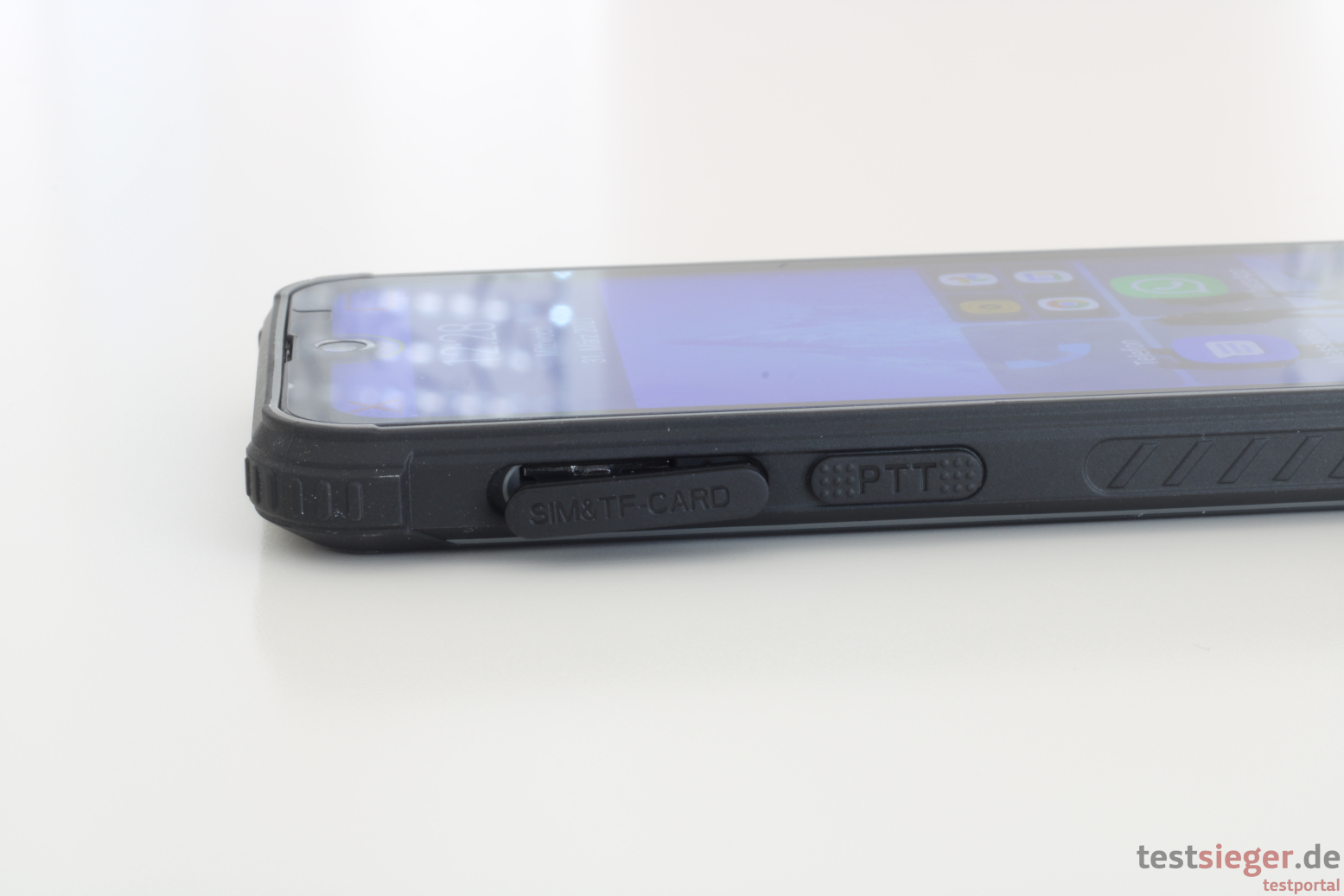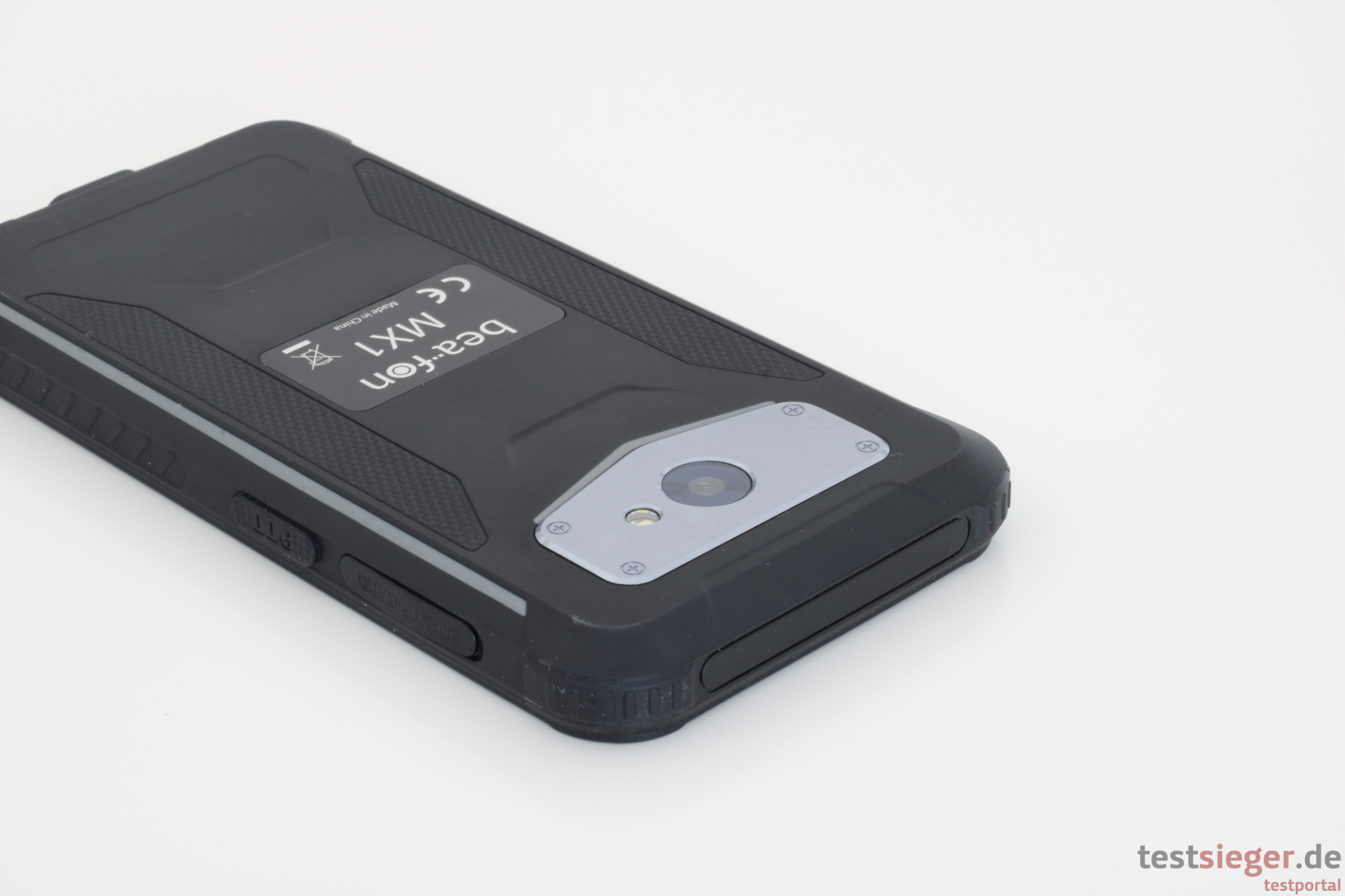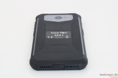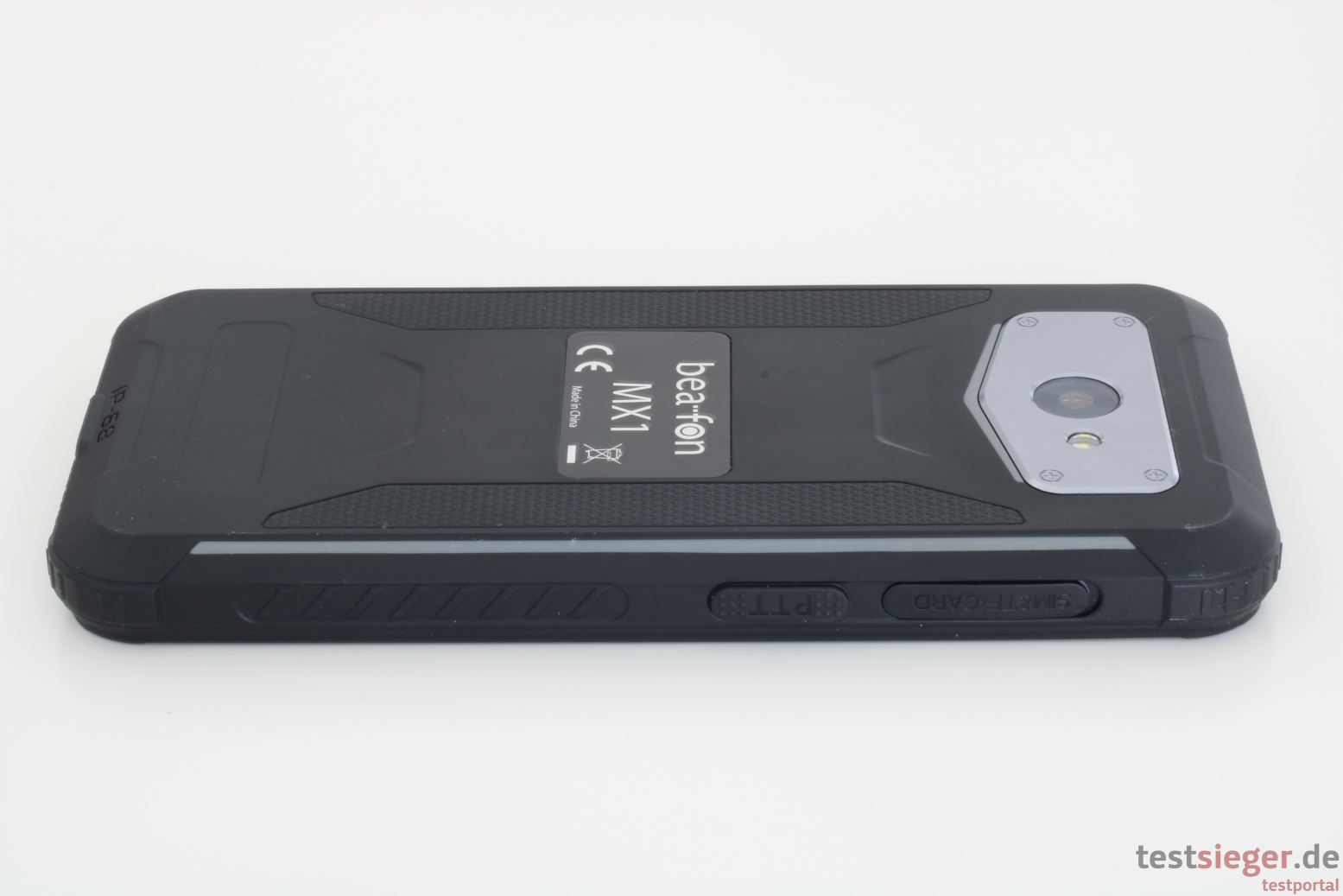 Auf der rechten Seite befinden sich der Standby-Knopf und die Laut- und Leise-Tasten. So weit, so klassisch: Allerdings bietet das MX1 auf der gegenüberliegenden Seite ein Bedienelement, das sich nicht so häufig bis gar nicht bei anderen Smartphones findet – die Push-to-Talk-Taste. In Kombination mit der vorinstallierten Zello-App verwandelt sich das Handy so in ein Walkie Talkie. Durch Tastendruck nimmt der Nutzer Sprachnachrichten auf, die in Echtzeit an einen oder mehrere Gesprächsteilnehmer übermittelt werden. Alle Tasten lassen sich auch mit kleinen Händen gut mit einer Hand erreichen. Allerdings haben sie unserer Meinung nach einen zu festen Druckpunkt. Das verhindert zwar Fehleingaben, ist aber im alltäglichen Betrieb nicht sehr angenehm. Einen Fingerabdrucksensor spart sich Bea-fon, was im Einsteiger-Outdoor-Bereich aber auch nicht üblich ist.