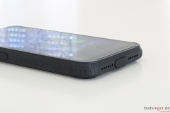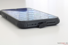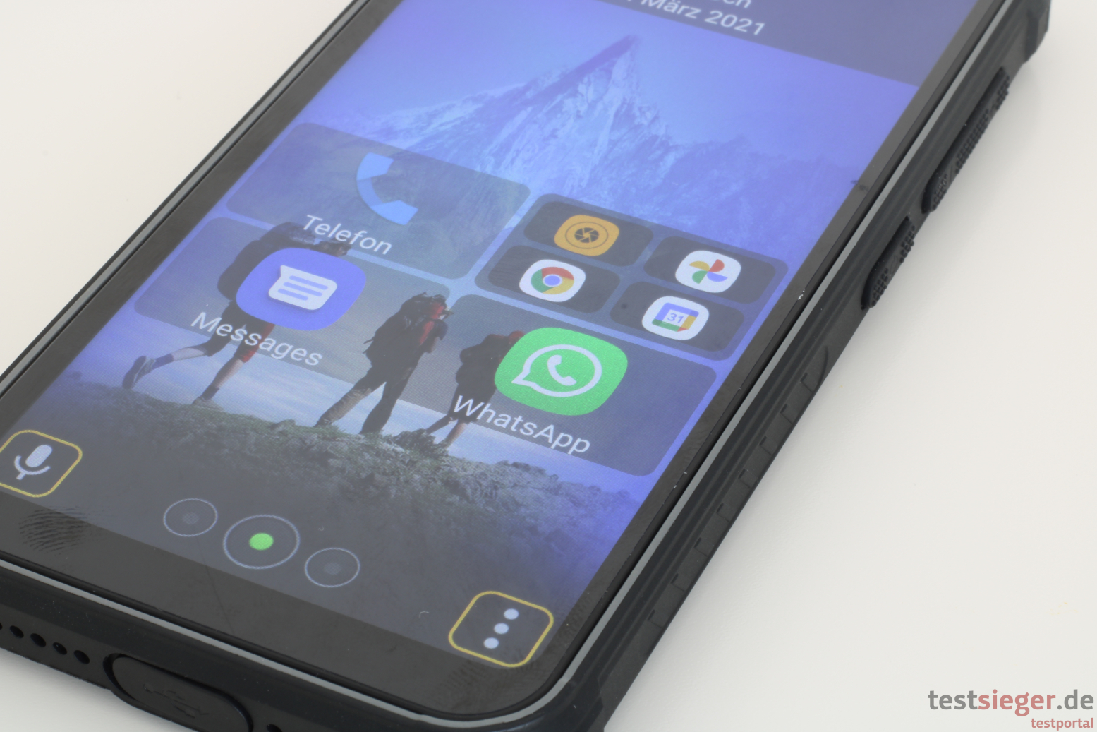 Die Frontkamera sitzt in einer Wassertropfen-Notch an der oberen Kante. Trotzdem muss der Nutzer teilweise mit recht großen Rändern um den Bildschirm leben. An der Unterseite misst der Rahmen knapp einen Zentimeter und ist damit am ausgeprägtesten. An den Rändern reduziert sich der Wert auf circa 0,5 Zentimeter, was durchaus annehmbar ist. Den Titel FullView-Display sichert sich das Bea-fon MX1 aber natürlich trotzdem nicht, was bei einem Outdoor-Smartphone aber auch nicht nötig ist. Schön: Im Lieferumfang befindet sich direkt eine Displayschutzfolie. Wer häufig im freien Gelände unterwegs ist, sollte auf diese nicht verzichten.