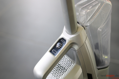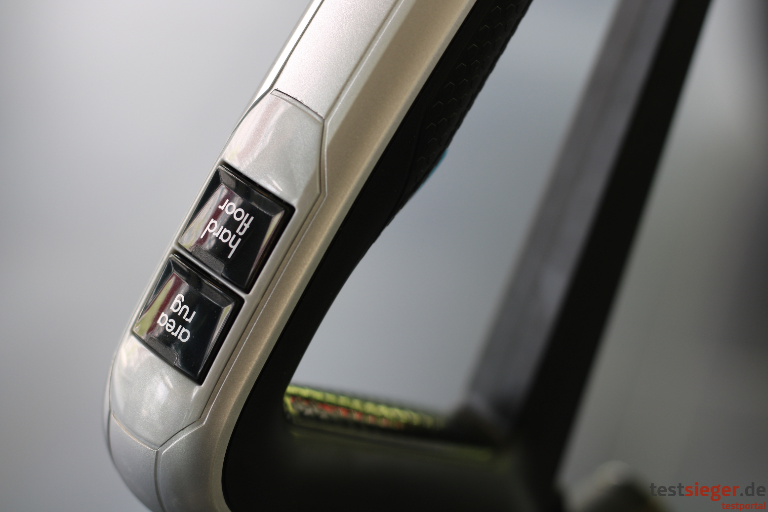Je eine Digitaltaste für Hart- und Teppichböden am Griff startet den Motor. Dann befindet sich der Bissel im Trockensaugmodus. Für die Nassreinigung kommt eine weitere Taste an der Unterseite der Halterung ins Spiel. Drückt der Nutzer diese für zehn Sekunden, fließt Wasser zur Bürstenrolle und befeuchtet diese – ein intelligentes System. Dass gerade Wasser fließt, signalisieren mehrere LEDs an der Saugdüse.