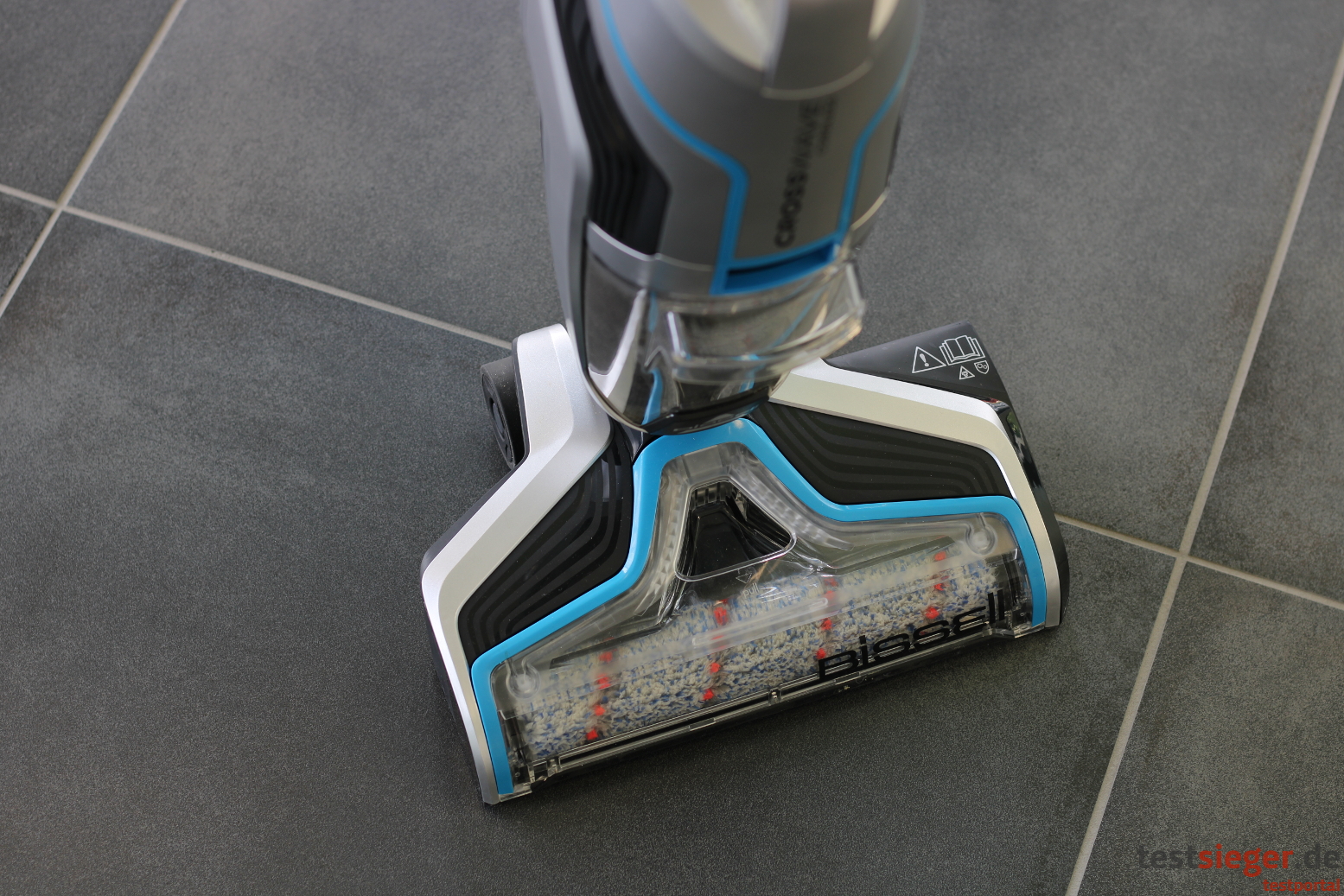 Trotz des hohen Gewichts ist die Handhabung insgesamt angenehm. Zwei Räder sorgen für einen flüssigen Lauf und der Nutzer muss nicht viel Kraft aufwenden, um den Bissell nach vorne zu bewegen. Zudem bietet der Griff genügend Platz, auch für große Hände. Bürste und Gehäuse sind mit einem großen Kugelgelenk verbunden, allzu flexibel ist der Crosswave trotzdem nicht. So bewegt sich die Düse beim Neigen des Griffs nur ein paar Grad nach links und rechts. Auch in der Bewegung nach unten ist der Bissell eingeschränkt. Er kommt zwar problemlos unter Tische und Stühle, unter den meisten Couchen und auch vielen Betten wird es allerdings problematisch. Das ausladende Gehäuse setzt recht schnell auf dem Boden auf und die Düse hebt dementsprechend ab.