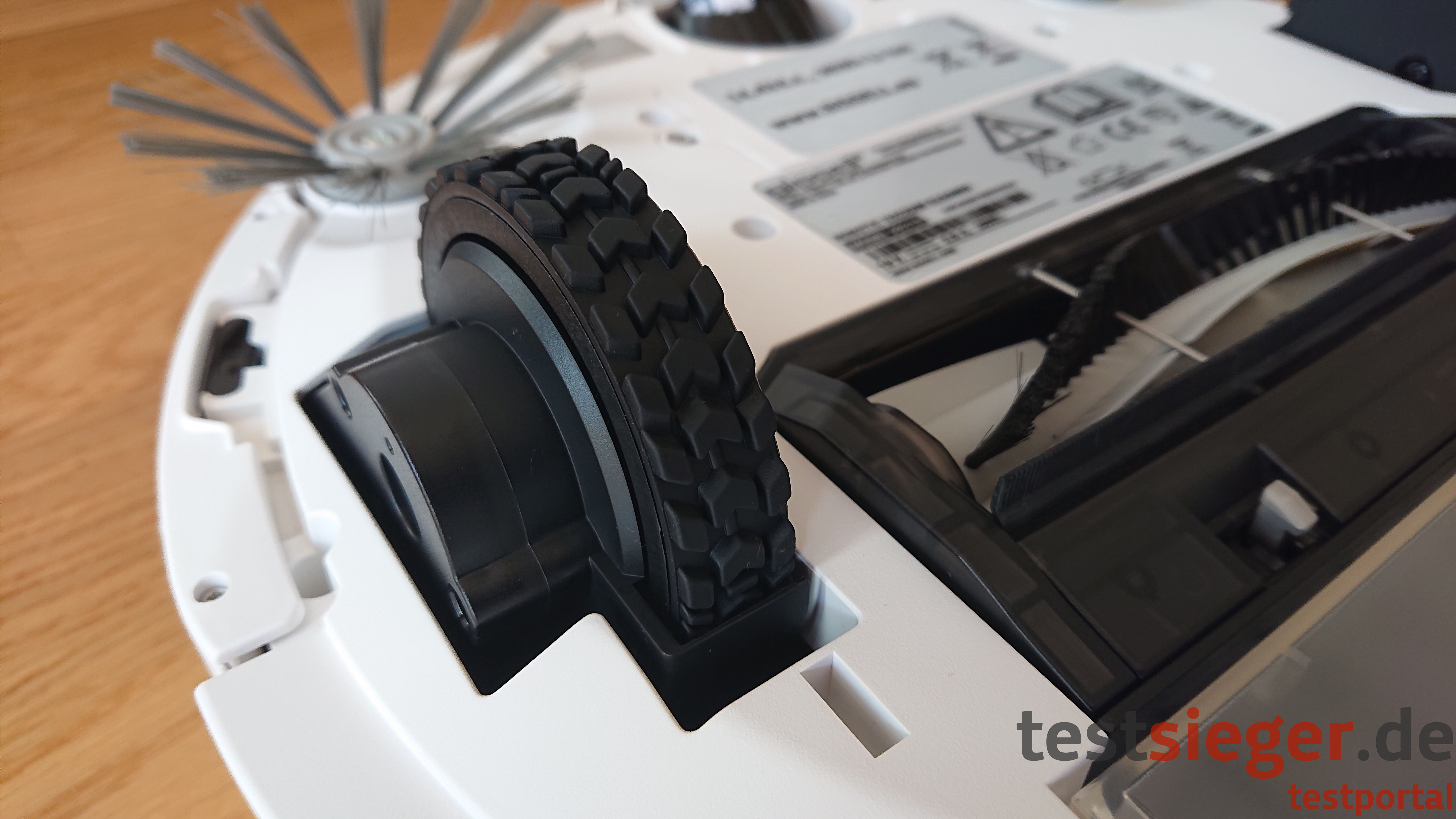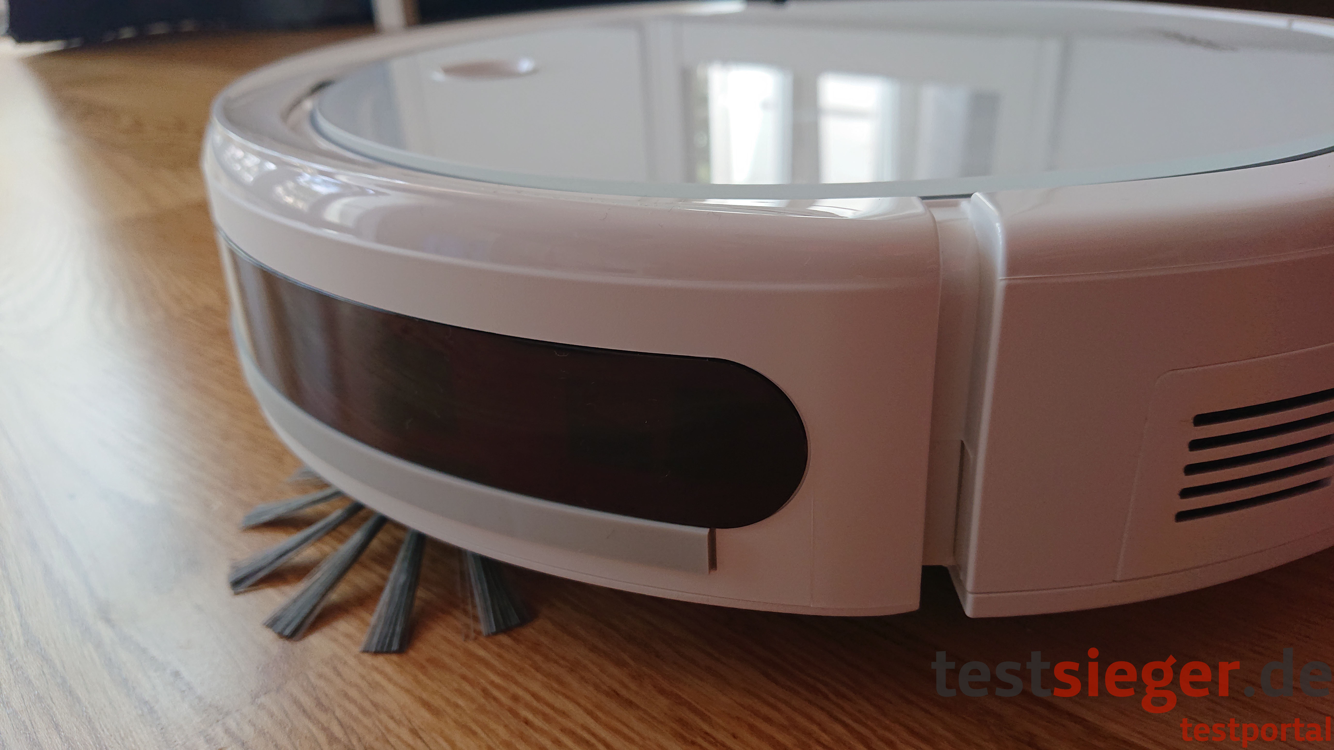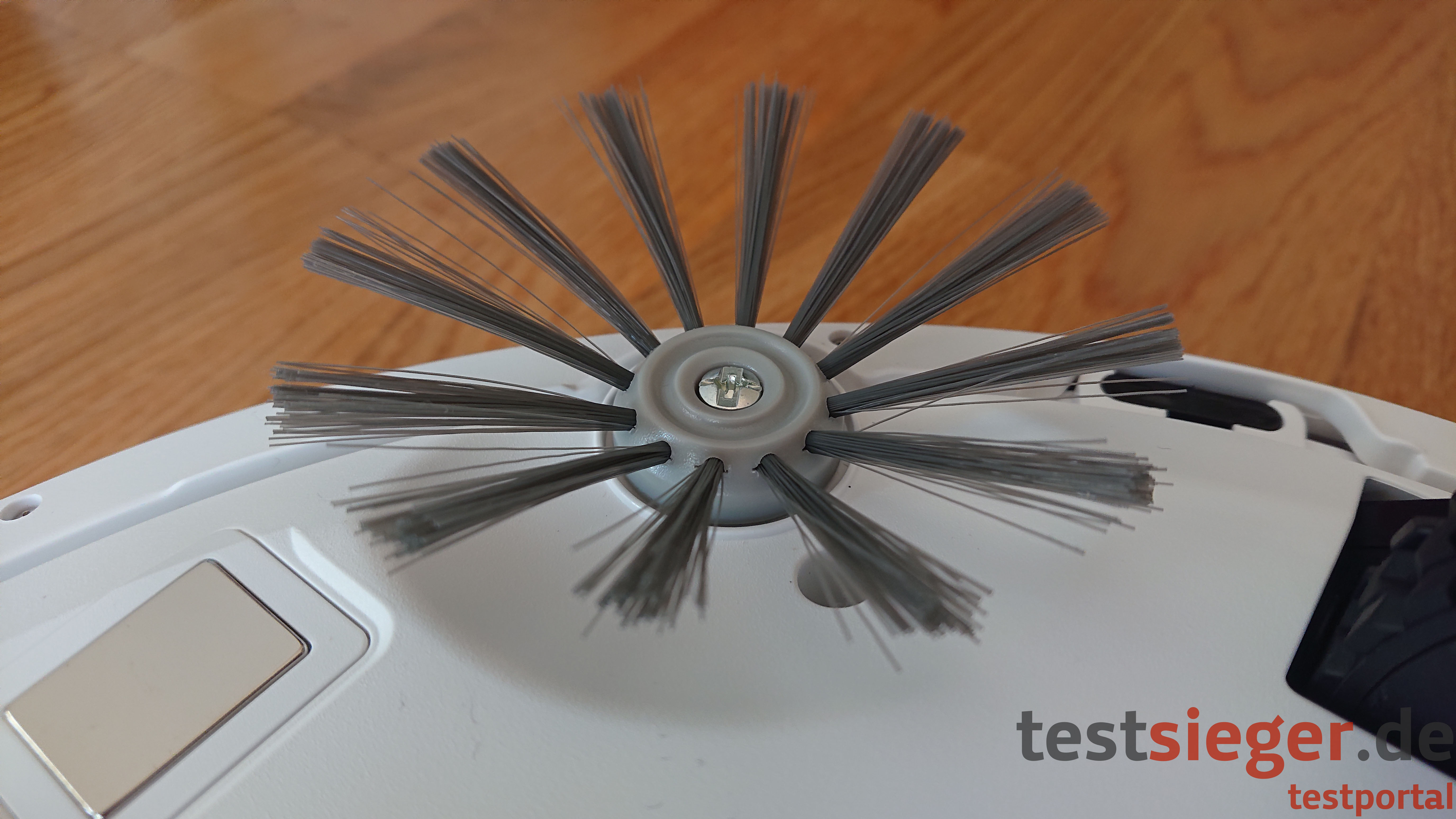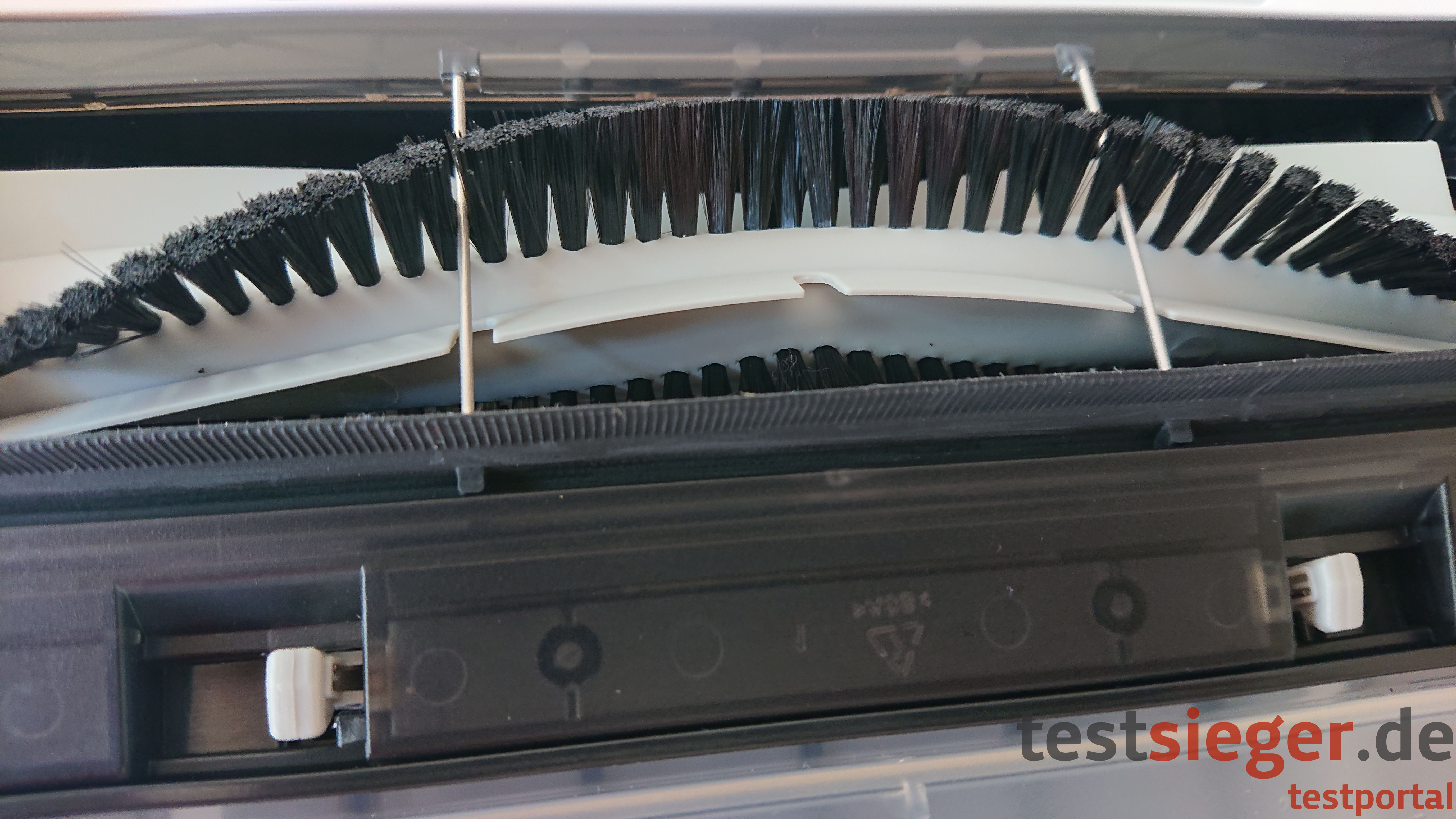Die beiden Kantenreinigungsbürsten rotieren während der Reinigung konstant und leiten den Dreck zur Düse und letztendlich in den Tank. Zusätzlich befindet sich eine längliche Bürstenrolle zwischen den zwei Rollen. Diese ist für die Aufnahme von Haaren oder Ähnlichem bestimmt.