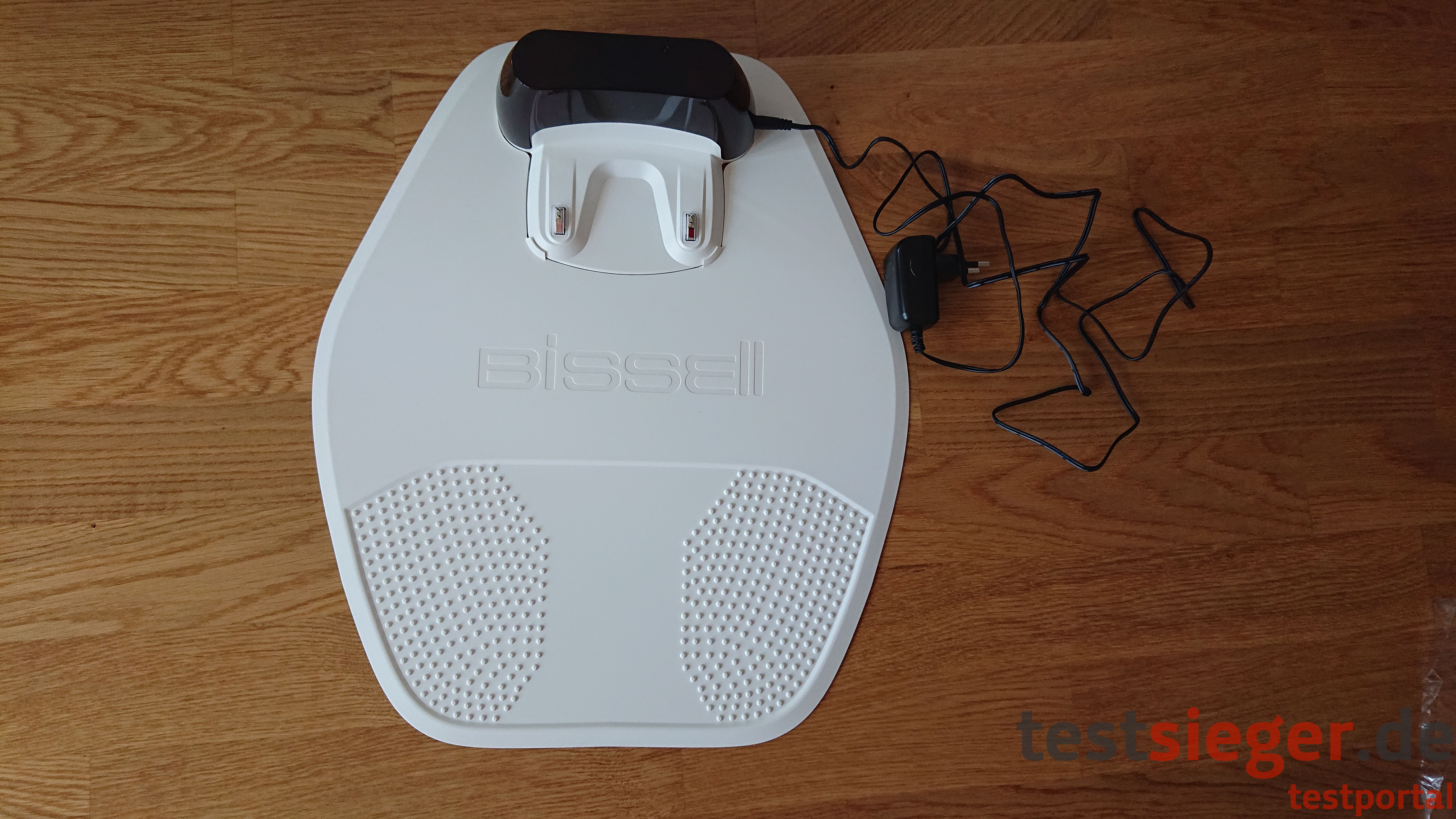 Der Bissell SpinWave ist direkt nach dem Auspacken nahezu funktionstüchtig. Vor dem ersten Gebrauch sollten Nutzerinnen und Nutzer jedoch einmal den Akku laden. Laut Hersteller vergehen vier bis fünf Stunden bis er voll aufgeladen ist. Die Betriebszeit soll circa 130 Minuten betragen. Nach ungefähr viereinhalb Stunden ist der Akku während unserem Praxistest aufgeladen, im normalen Reinigungsmodus hält er dann gute 90 Minuten durch. Ein guter Wert, auch wenn er die Herstellerangaben nicht erreicht. So lange der Akku lädt, leuchtet die Start/Pause-Taste, welche sich direkt auf der Oberseite des Geräts befindet, immer wieder auf. Ist der Ladevorgang beendet, leuchtet das Licht durchgehend.