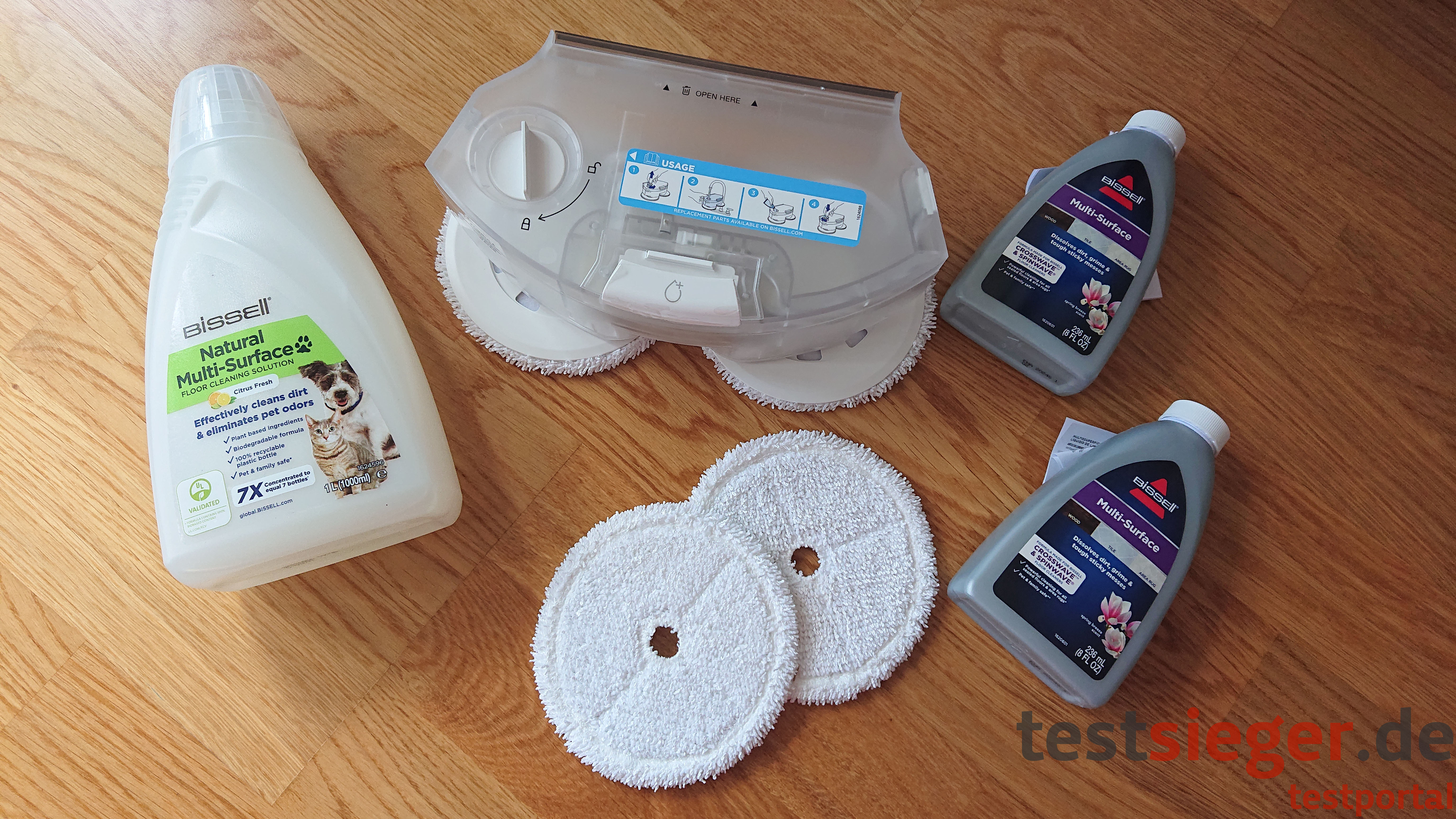 Die Mopp-Pads können mit Maschinenwäsche gewaschen werden und sind damit wiederverwendbar, was wir gut und nachhaltig finden. Die sauberen Pads werden mittels Klett an die Antriebselemente angebracht. Bissell empfiehlt, die Bürstenrolle, den Filter, den Staubtank und die Mopp-Pads regelmäßig zu reinigen, aber nicht nach jeder Anwendung. Das übrige Reinigungswasser aus dem Wassertank sollten Nutzerinnen und Nutzer nach jeder Anwendung wechseln, um Schimmelbildung vorzubeugen.