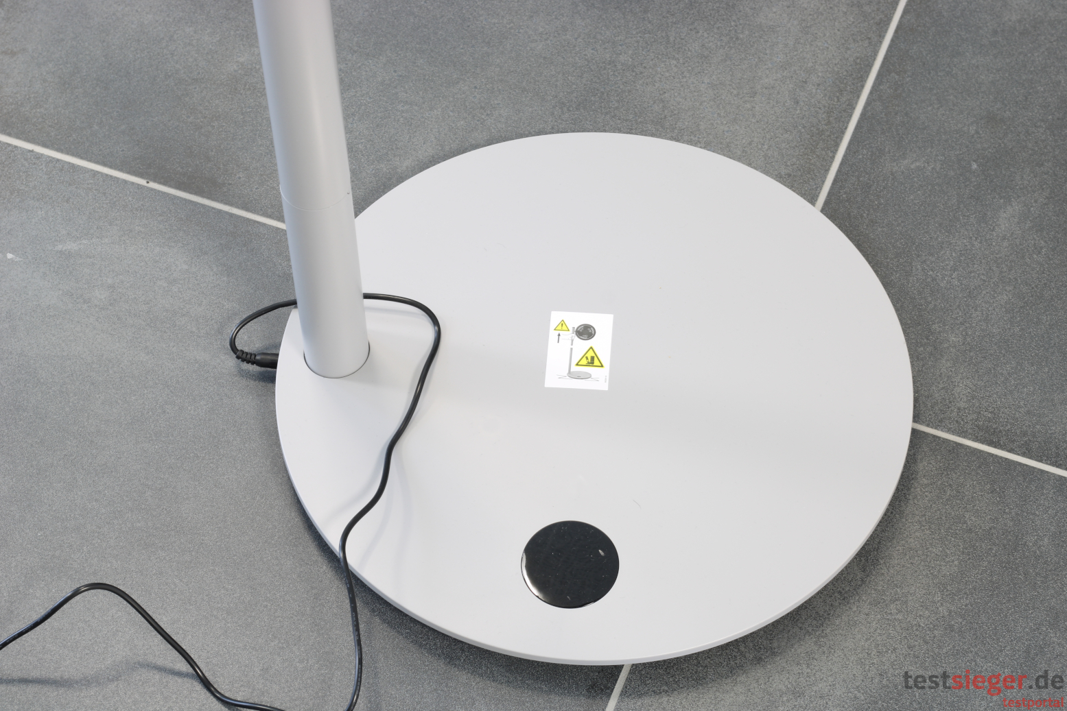Bedienung und Handhabung sind schnell erlernt und bereiten im Test keine Probleme. Die Trommel ist über ein Drehgelenk an der Stange befestigt und lässt sich um 270 Grad nach oben und unten verstellen. So können Nutzerinnen und Nutzer individuell entscheiden, ob der Ventilator die Luft zur Seite oder nach oben abgeben soll. Letzteres nennt BONECO Air-Shower-Effekt, hier wird die Luft indirekt über die Wände im Raum verteilt. Eine Schwenkfunktion ist nicht vorhanden, hier müssen Nutzerinnen und Nutzer den gesamten Ventilator drehen. Hier hätten wir uns zumindest einen manuellen Schwenkmodus über die Haltestange gewünscht. Der Stromanschluss befindet sich im Standfuß, das Gestänge leitet die Energie weiter zur Turbine. Das Kabel fällt mit 250 Zentimetern sehr lang aus und bietet eine gute Flexibilität.
