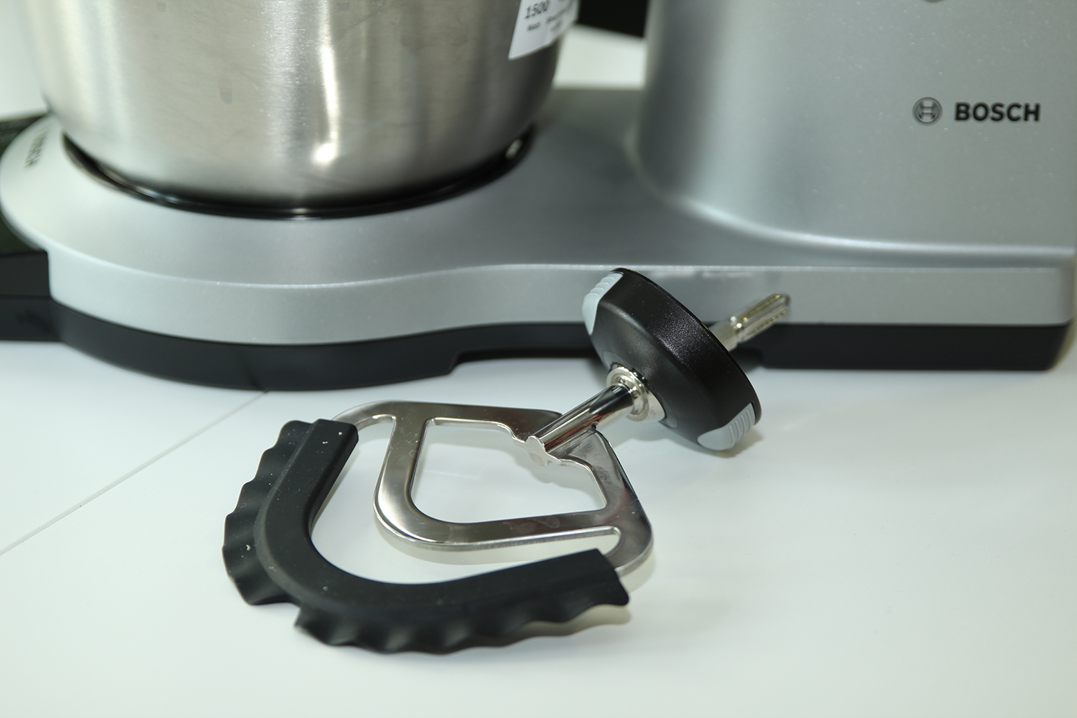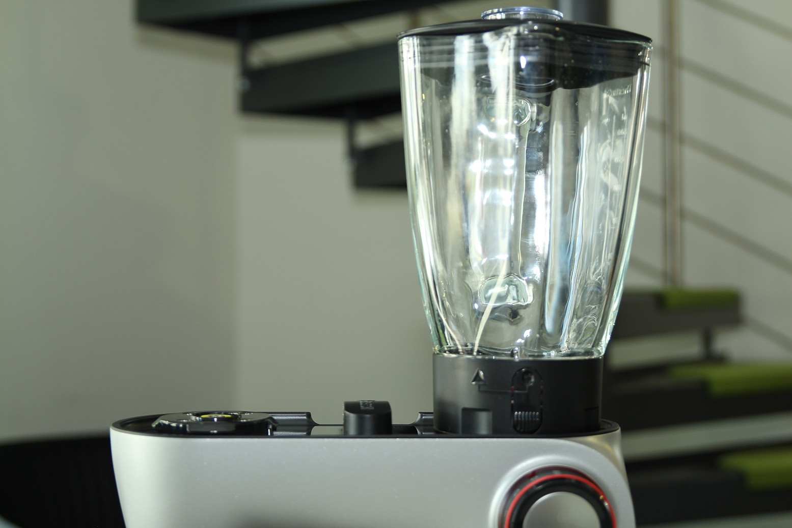 Das Drehrad ist sehr leichtgängig und mit kleinen Widerständen ausgestattet, damit sich die verschiedenen Geschwindigkeitsstufen einfach auswählen lassen. Eine Pulse-Funktion ist ebenfalls vorhanden. Dazu das Rad auf die Stufe M/A stellen und halten. Hier wird auch die Sensor-Control-Plus-Funktion aktiviert. Nach zwei Sekunden rastet der Drehregler auf der Position ein und geht automatisch in den Aus-Zustand, wenn die Zubereitung beendet ist. Das Drehrad lässt sich ausschließlich verwenden, wenn der Rührarm nach unten geklappt ist und die Schüssel eingesetzt ist. Damit ist eine optimale Sicherheit gegeben, bringt allerdings auch den Nachteil, dass sich beispielsweise der Mixer nicht verwenden lässt, wenn die Schüssel gerade in der Spülmaschine ist.