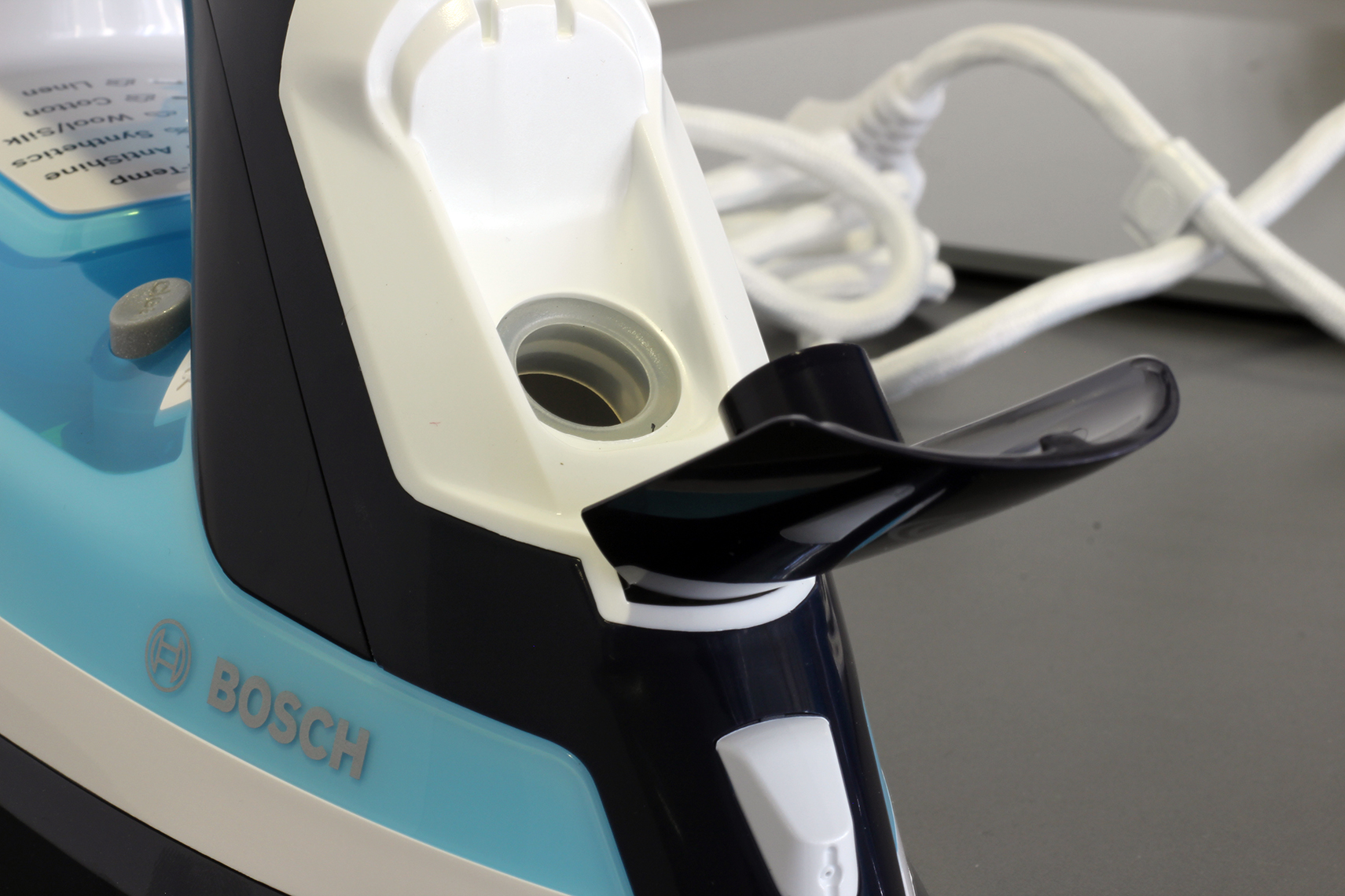 Der Wassertank ist fest verbaut und fasst knapp 310 Milliliter. Damit liegt er im oberen Mittelfeld und erlaubt circa 20-minütige Bügeleinsätze am Stück. Die Öffnung liegt hinter einer großen Klappe an der Vorderseite. Im Vergleich zur voluminösen Klappe ist das Loch recht klein ausgefallen. Praktischerweise hat Bosch jedoch eine komfortable Einfüllhilfe beigelegt. Durch den durchsichtigen Kunststoff ist der Wasserstand gut erkennbar. Der Tankdeckel ist zwar nicht gefedert, verfügt jedoch über einen kleinen Widerstand und wackelt daher nicht. Ein einfacher Klickmechanismus hält den Deckel sicher geschlossen.