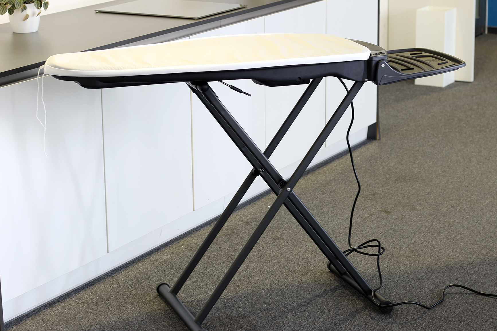Das Bügelbrett kommt komplett montiert. Einzig die Stange für die Kabelaufhängung ist nicht am Tisch selbst befestigt. Stattdessen kann der Nutzer flexibel entscheiden, ob er sie an der linken oder rechten Seite anbringen möchte – eine gute Lösung. Die Bedienungsanleitung ist sehr ausführlich und erklärt alle Funktionen und Bedienmöglichkeiten. Die Höhenverstellung reicht – in sieben Stufen – von 81 Zentimetern bis zu 93 Zentimetern. Ein seitlicher Hebel löst die Einrastfunktion und ermöglicht ein einfaches Zusammenklappen. Beim Ausklappen empfehlen wir, den Tisch auf die Hinterseite zu stellen und das vordere Bein wie einen Hebel nach unten zu klappen. Die Betätigung des Griffs an der Seite ist hier nicht zwingend notwendig. Zwei Rollen an einem der Standfüße erleichtern den Transport ungemein – einfach die gegenüberliegende Seite des Tisches anheben und an die gewünschte Stelle fahren. Allerdings quietschen die beiden Rollen etwas unangenehm. Über ein Verschlusssystem kann der Nutzer den gespannten Stoffbezug recht einfach lösen und abnehmen. Das Wiederaufziehen gestaltet sich ebenfalls einfach, allerdings hätten wir uns noch weitere Fixierungsmöglichkeiten an den Seiten gewünscht. So verrutscht der Stoff hier leicht.