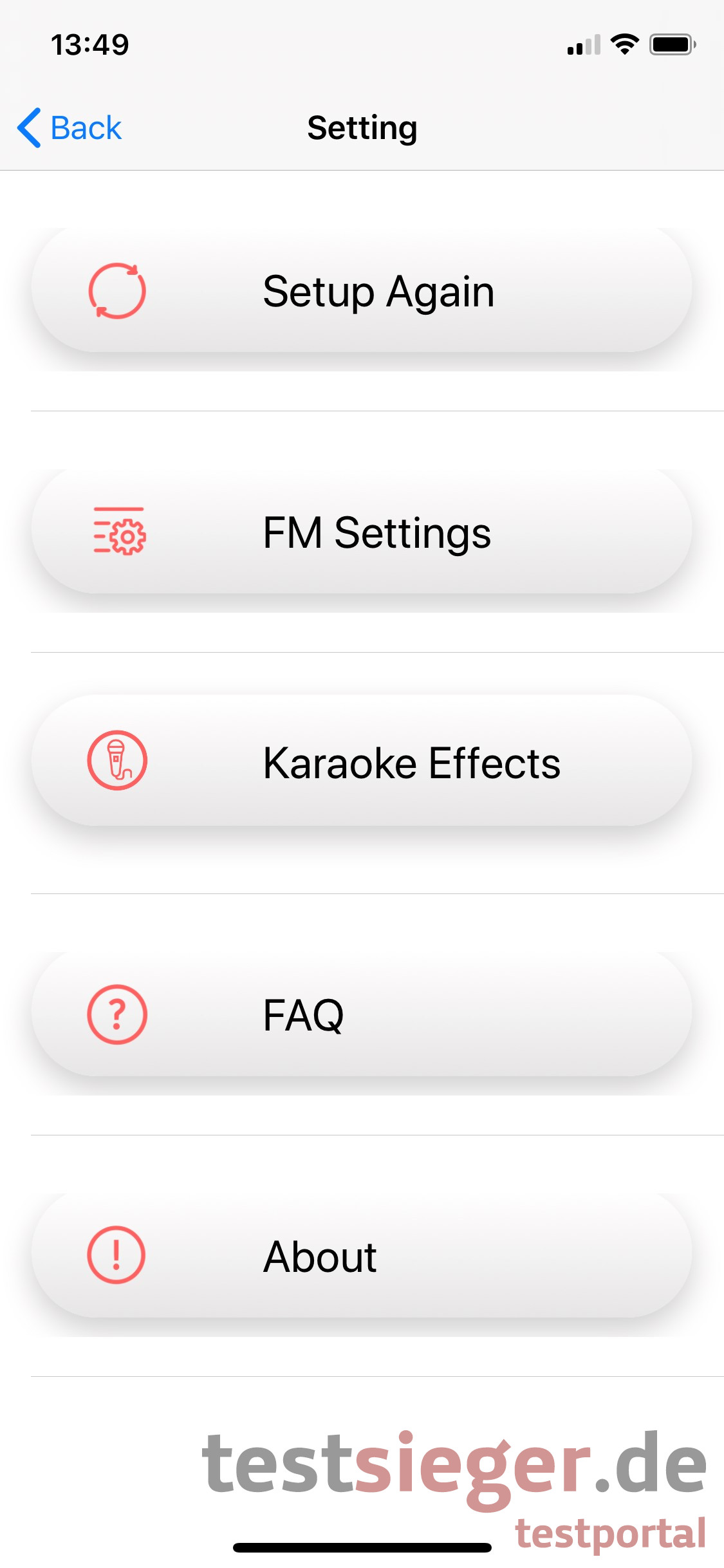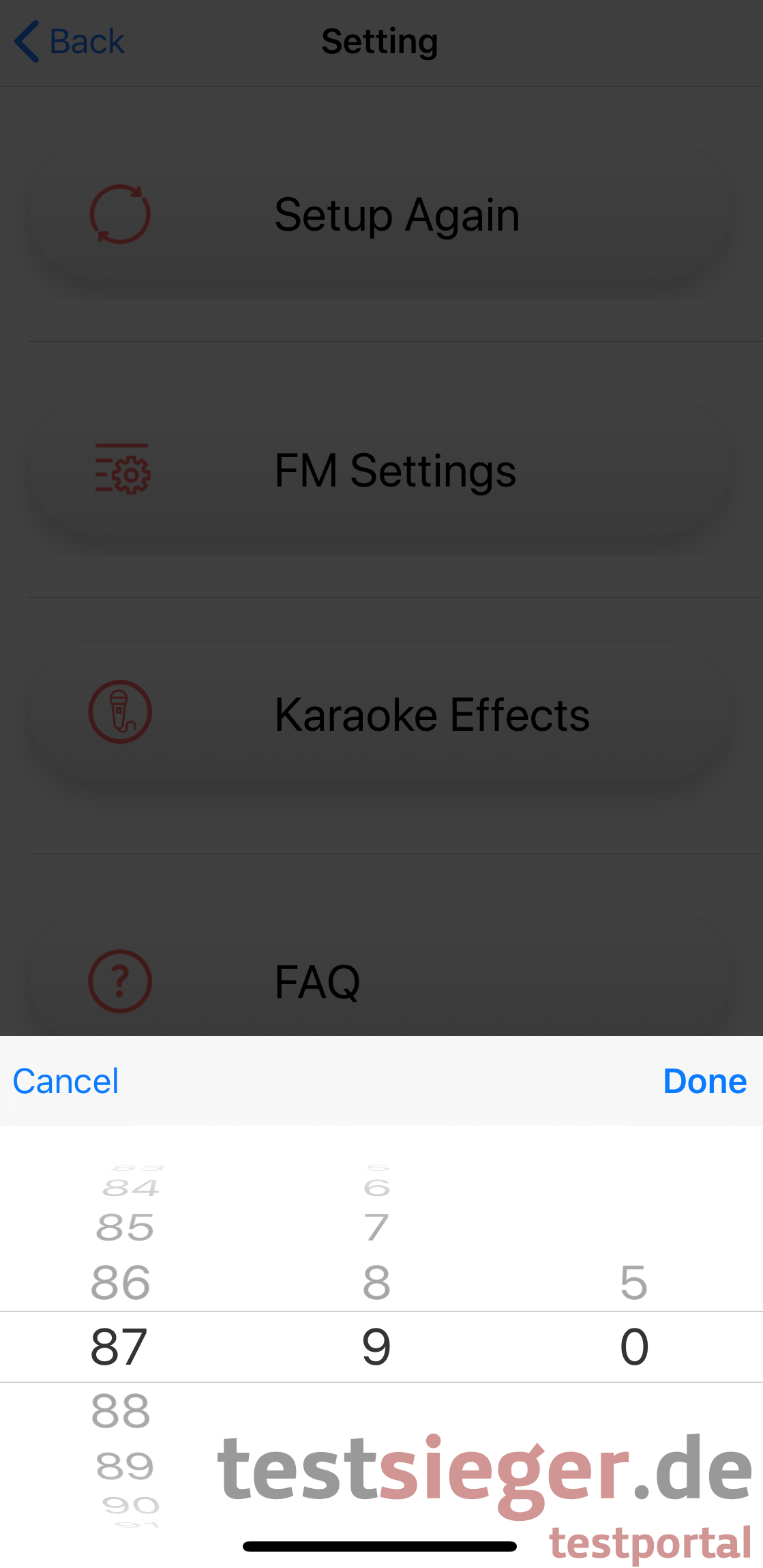 Im folgenden Schritt wird nun das Karaoke-Gerät per Bluetooth mit dem iPhone verbunden. Ein Button in der App soll direkt zu den iPhone-Einstellungen führen. Bei uns funktioniert dies jedoch nicht. Wir müssen die App schließen und selbst ins Menü navigieren. Auch hier gibt es anfangs Probleme, da das Smartphone das Karaoke-Gerät nicht auf Anhieb findet. Nach mehrmaligen Versuchen klappt das aber auch. Einmal verbunden wird die App wieder geöffnet und die Installation ist abgeschlossen. Nun kann der Nutzer noch verschiedene Einstellungen wie FM-Settings oder Karaoke-Effekte vornehmen.
