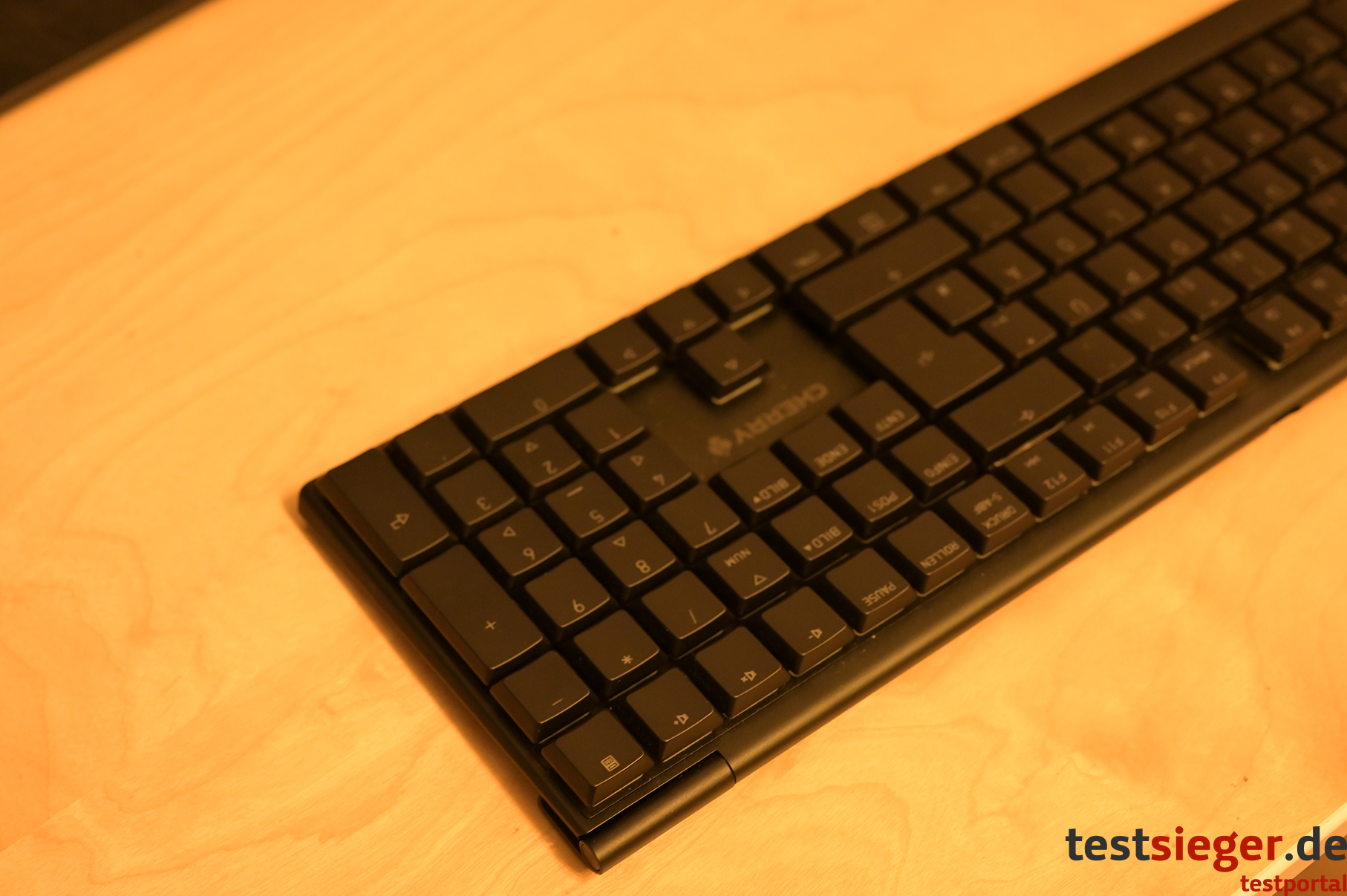 Die CHERRY MX 10.0N RGB ist eine sehr hochwertig verarbeitete mechanische Tastatur. Das Gehäuse sowie der automatisch wieder einklappende Standfuß über die komplette Breite des Eingabegeräts sind komplett aus Aluminium. Das ermöglicht die besonders flache Bauweise im Vergleich zu Geräten die größtenteils aus Kunststoff bestehen. Für eine Tastatur mit Nummernblock ist sie mit ihren Maßen von 42,5 Zentimetern in der Länge, 12,7 Zentimetern in der Breite und einer Höhe von knapp zwei Zentimetern äußerst kompakt und sehr flach.