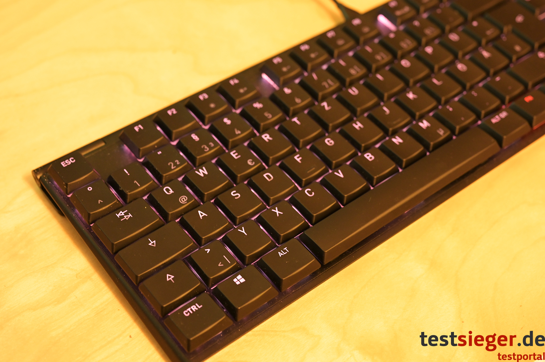 Das Schreibgefühl ist dabei sehr angenehm. Die Tasten, die mit der CHERRY MX LOW PROFILE RGB SPEED Tastentechnologie ausgestattet sind, sind angenehm groß. Der Abstand zwischen ihnen ist allerdings recht gering. Das führt gerade in der Eingewöhnungsphase in unserem Test häufiger zum Vertippen. Es benötigt etwas Übung, um mit der CHERRY MX 10.0N RGB sauber und schnell schreiben zu können. Ähnliches stellen wir auch beim Spielen in verschiedenen Situationen fest. Gerade in hektischen Aktionen kommt es häufiger vor, dass wir zwei Tasten auf einmal drücken. Auch der Abstand der vier Pfeiltasten zwischen Nummernblock auf der rechten Seite und der STRG-Taste links davon ist recht knapp bemessen. Im weiteren Verlauf des Tests verringern sich diese Fehler hingegen deutlich.