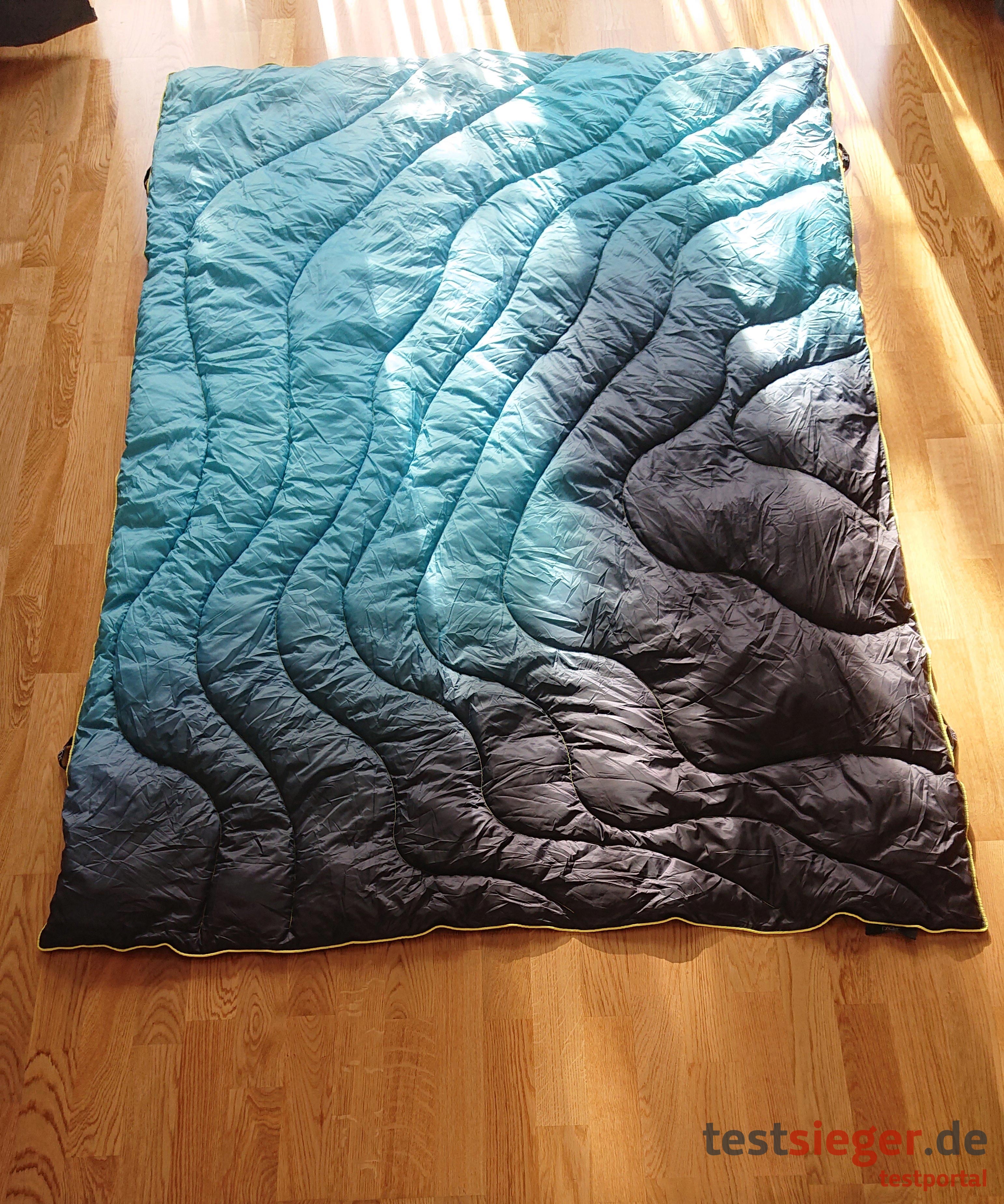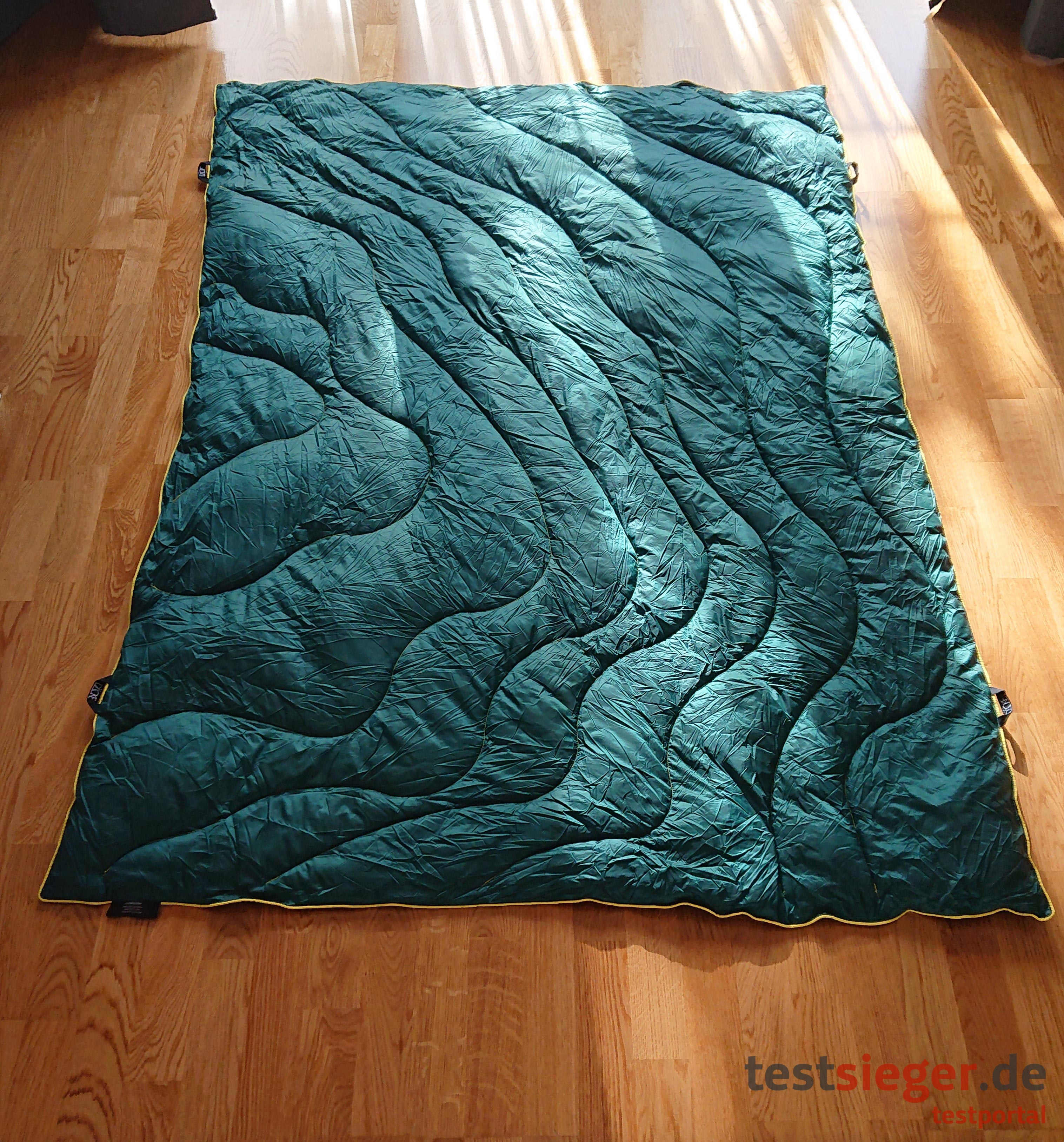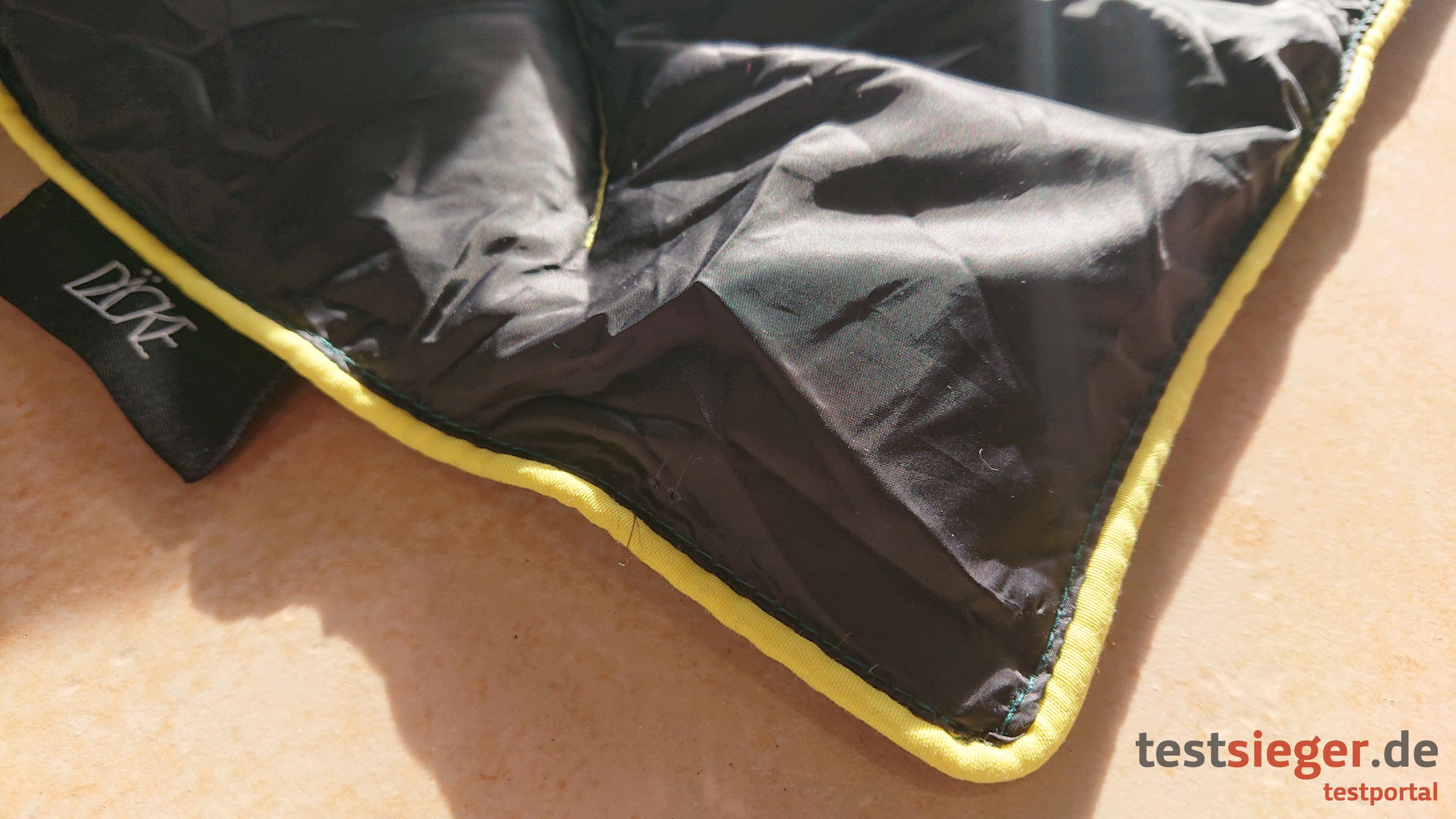 Seite der Decke besteht aus 100 Prozent Polyester. Die Rückseite aus 100 Prozent Nylon. Dieses Material ist optimal für den Outdoor-Gebrauch, denn es gilt als besonders robust. Auch nach unserem Praxistest können wir die Decke als widerstandsfähig beurteilen. Weder die Nähte noch das Material selbst, sind nach unserem Belastungstest gerissen oder beschädigt. Als Innenmaterial verwendet der Hersteller Kunstdaunen aus 100 Prozent Polyester. Dadurch ist die Decke nicht nur angenehm weich, sondern auch noch allergikerfreundlich.