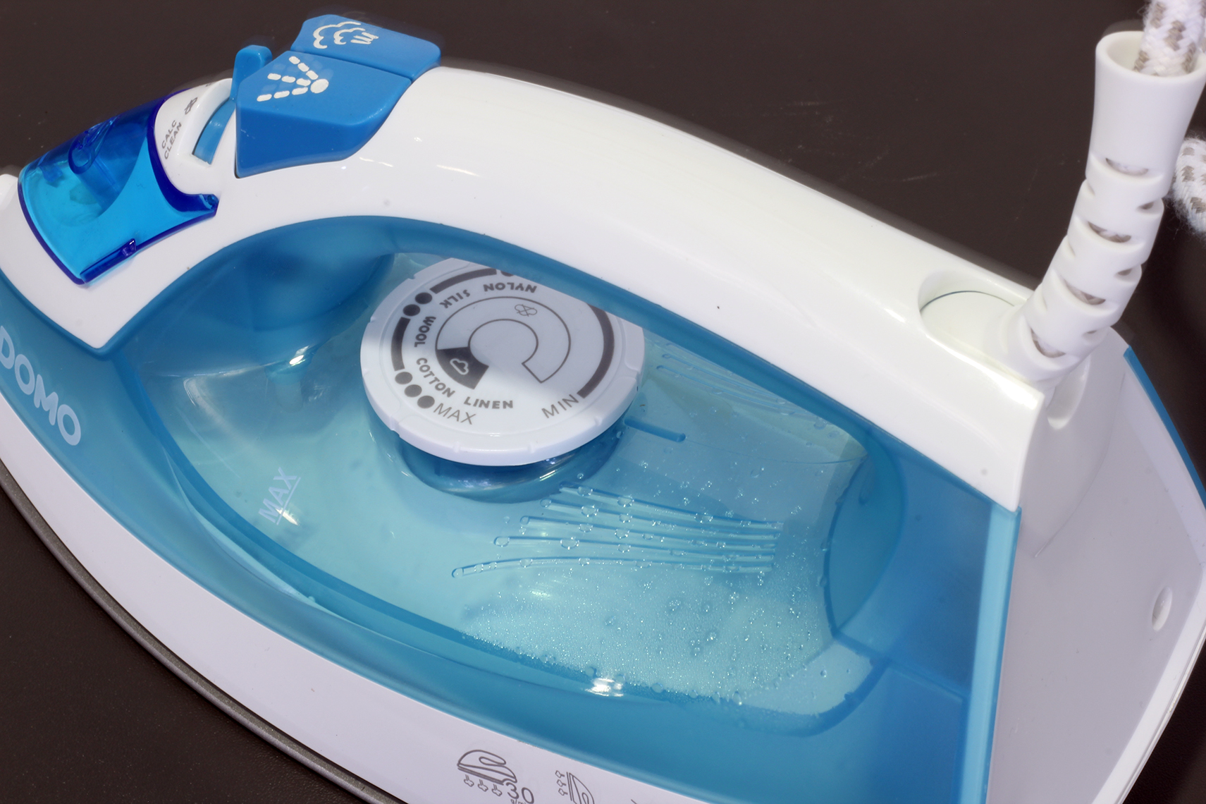Der 200-Milliliter-Tank erlaubt nur kurze Bügeleinsätze von 10 – 15 Minuten am Stück. Danach muss der Nutzer wieder den Gang zum Wasserhahn antreten. Der Dampfstoß erzeugt laut Domo 30 Gramm pro Minuten und kommt sehr zuverlässig. Allerdings tritt häufig noch etwas Wasser mit aus.