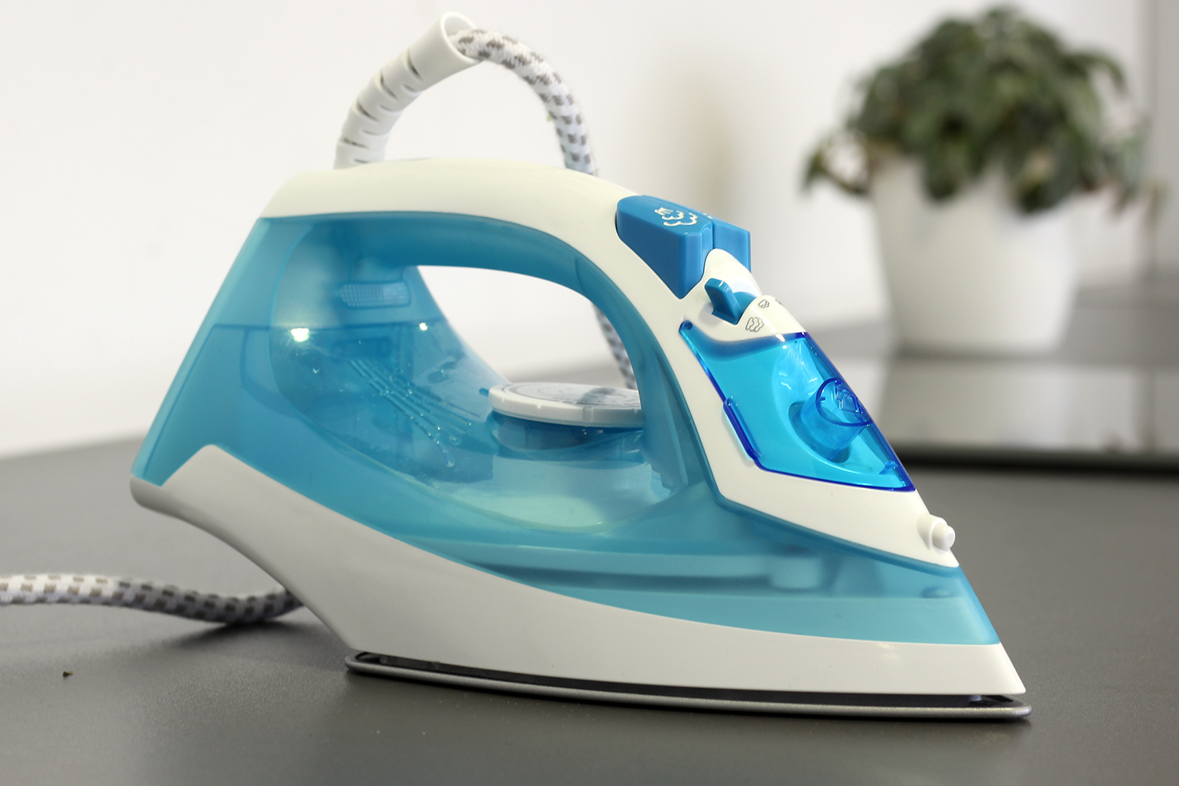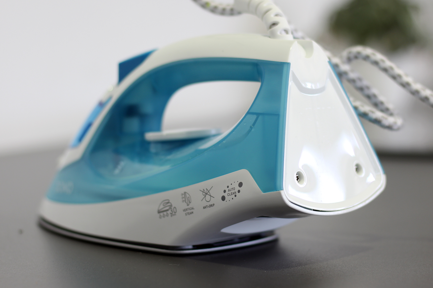 Das Stromkabel misst knapp zwei Meter und erlaubt eine gute Flexibilität. Sobald Strom fließt, heizt das Bügeleisen auf. Nach gerade einmal 25 Sekunden ist die höchste Stufe erreicht – ein hervorragender Wert. Eine orangefarbene Lampe zeigt den Betriebszustand an – erlischt diese, ist die gewünschte Temperatur erreicht. Ein kleines Drehrad passt die Hitze an die verschiedenen Textilarten an – beispielsweise Nylon, Seide, Wolle, Baumwolle oder Leinen. Das Rad ist recht schwergängig, was die Bedienung mit nur einem Finger nahezu unmöglich macht. Unser Tipp: Mit Daumen und Zeigefinger über den Griff fassen.
