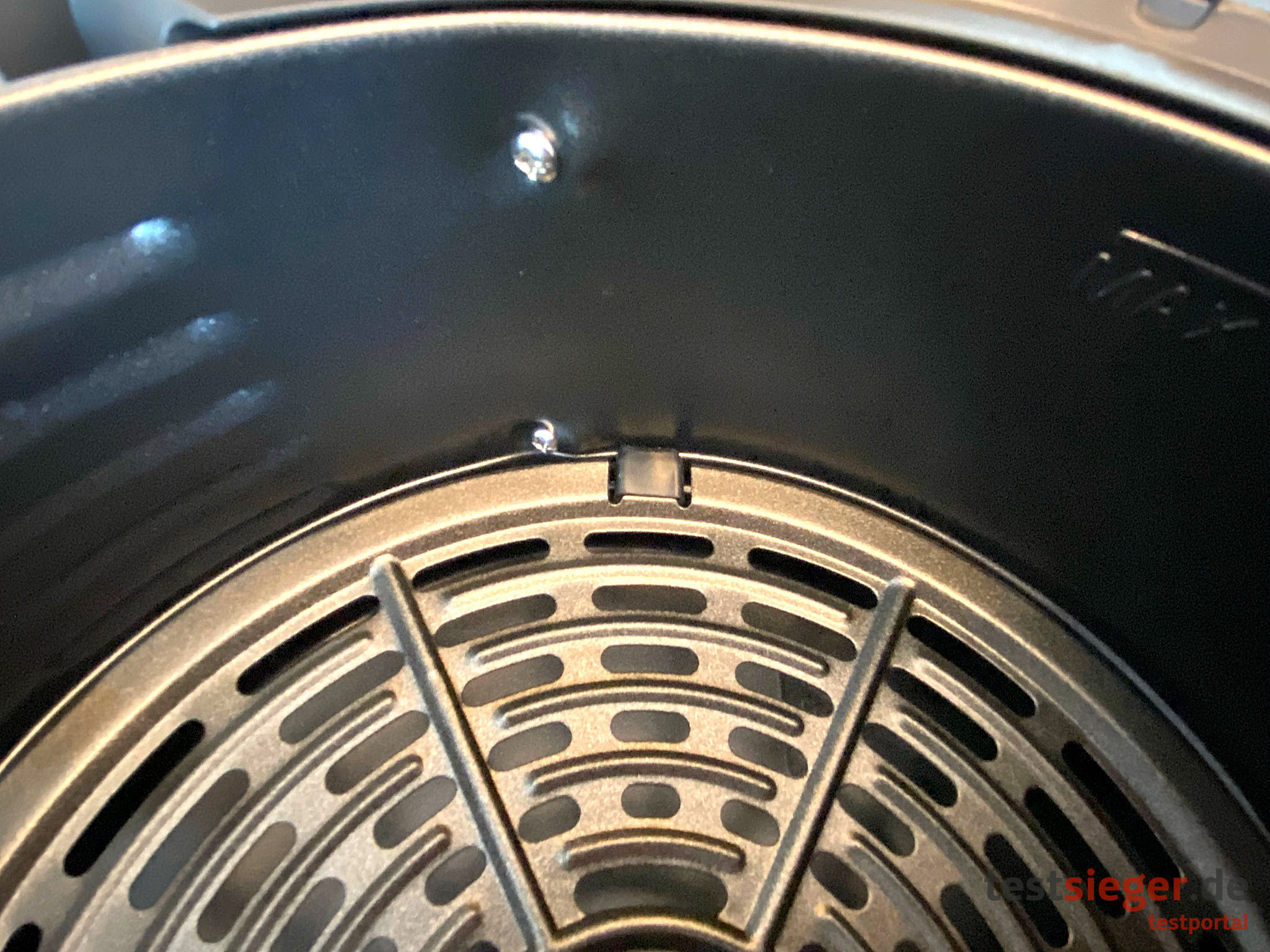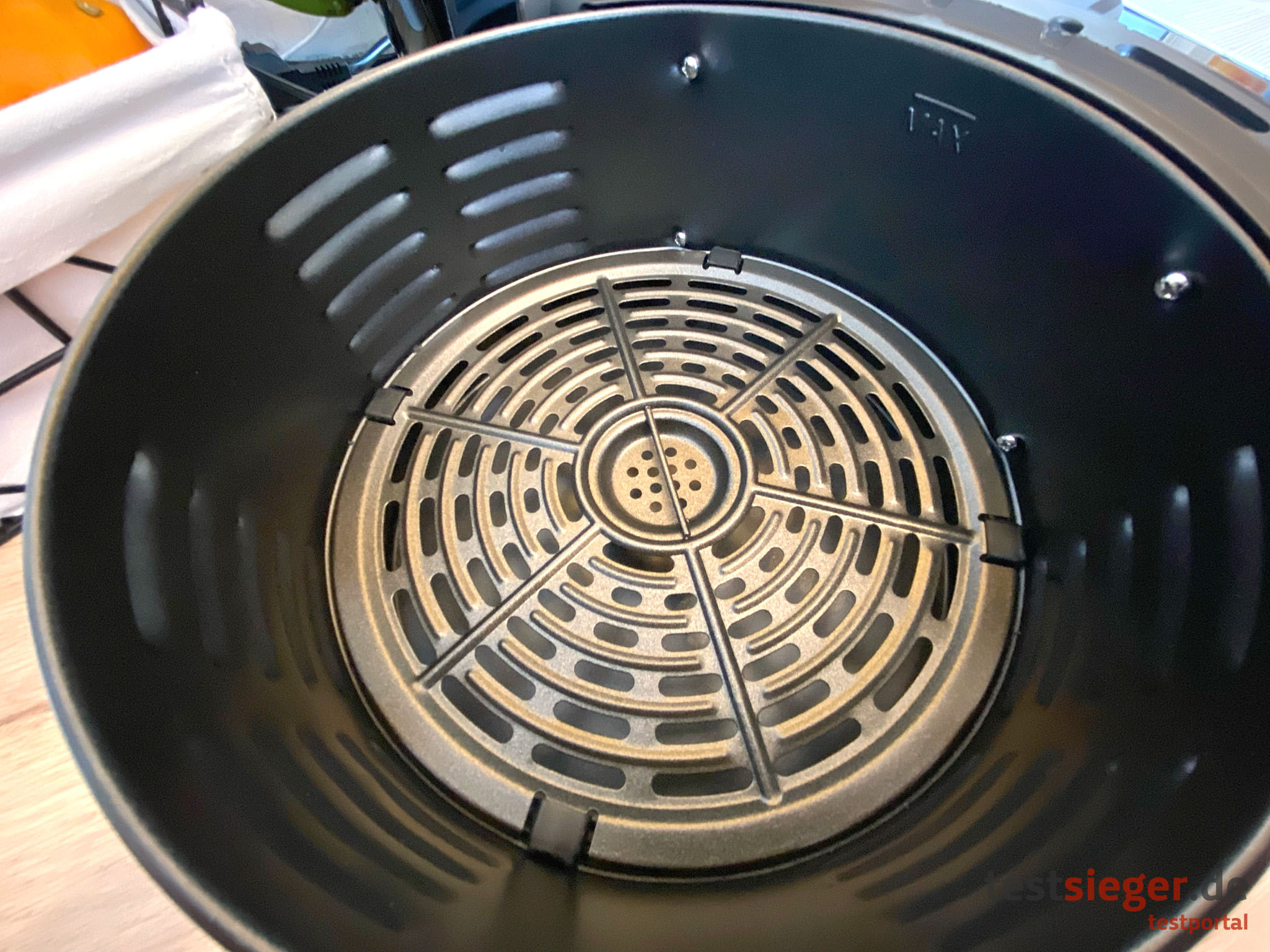 Für die Sicherheit ist bei der Eden ED-7005 gesorgt. Zum einen sorgen die Antirutschfüße für einen extrem festen Stand, zum anderen ist die Heißluftfritteuse mit einem Überhitzungsschutz ausgestattet. Mit dem Cool-Touch-Griff nehmen Nutzerinnen und Nutzer den Frittierkorb problemlos heraus. Vorsicht ist aber stets geboten, denn die Oberfläche der Fritteuse erwärmt sich während des Betriebs leicht, an der Rückseite und den Spalten zwischen Frittierkorb und Gehäuse spüren wir eine deutliche Erhitzung. Genügend Abstand (der Hersteller gibt hier mindestens 10 Zentimeter an) um das Gerät herum sollten während des Betriebs stets eingehalten werden. Der herausnehmbare Frittiereinsatz ist nicht spülmaschinengeeignet, die Reinigung geht aber leicht und schnell von der Hand. Auch der Frittierkorb lässt sich problemlos von Hand säubern.
