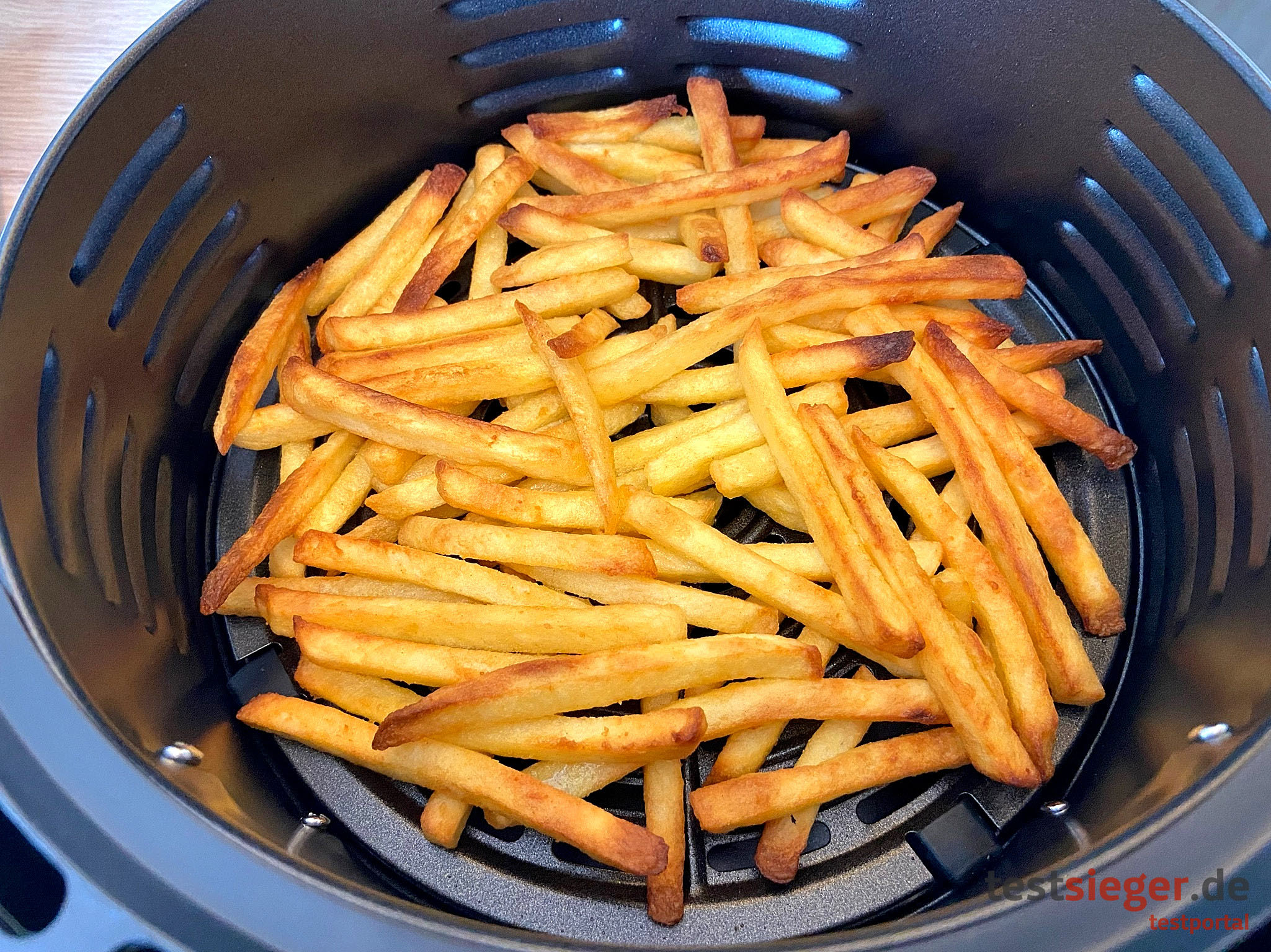 Wie in der Anleitung empfohlen, prüfen wir die Ergebnisse nach der Hälfte der Zeit. Bereits jetzt weisen die Pommes Frites einen wunderbaren Bräunungsgrad auf. Bei einem volleren Korb sind 20 Minuten mit einer Durchmischung nach 10 Minuten durchaus realistisch. Mit unserer Portion Pommes sind wir sehr zufrieden, sie sind schön kross und nicht verbrannt. Die Hitzeverteilung im Innern der Fritteuse ist sehr gut ausbalanciert, auch Kartoffelsticks am Rand sind gleichmäßig frittiert. Für die dickeren Kartoffelviertel folgen wir der Anweisung der Verpackung und stellen 180 Grad für 20 Minuten ein. Auch hier überzeugen uns die Ergebnisse völlig.