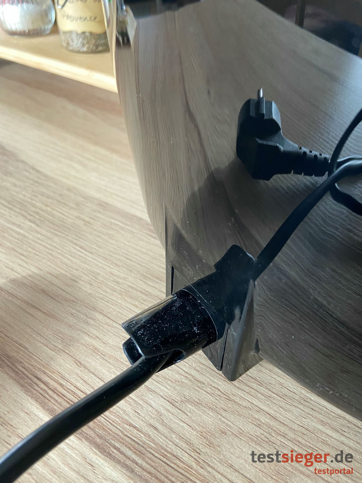 Schon als wir die Eden ED-7012 aus der Verpackung holen, fällt uns die Größe des Geräts auf. Die Heißluftfritteuse wiegt 5 Kilogramm und ist damit nicht besonders leicht. In Sachen Maße läuft sie mit einer Höhe von 37 Zentimetern und einem Durchmesser von 24 bis 26 Zentimetern auf. Der Umfang an der breitesten Stelle beträgt 102 Zentimeter. Eine recht große Angelegenheit, für die Nutzerinnen und Nutzer entsprechend viel Platz in der Küche einplanen sollten. Die Heißluftfritteuse kommt in glänzendem Schwarz daher mit einzelnen silbernen Elementen, die das Design auflockern. Der Griff hebt sich mit mattem Silber ab, ein glänzender silberner Rahmen umfasst das Display und setzt sich fort bis zur flachen Oberseite des Geräts. Nicht nur das schlichte, elegante Design, sondern auch die abgerundete Bauweise sagen uns zu, dies ist aber natürlich Geschmackssache. Die Kabellänge von 1 Meter ist gut bemessen, ein wenig mehr Spielraum hätte aber auch nicht geschadet. Vier gummierte Standfüße an der Unterseite halten das Gerät extrem fest an Ort und Stelle, was, wie wir später beim Betrieb erfahren, auch nötig ist.