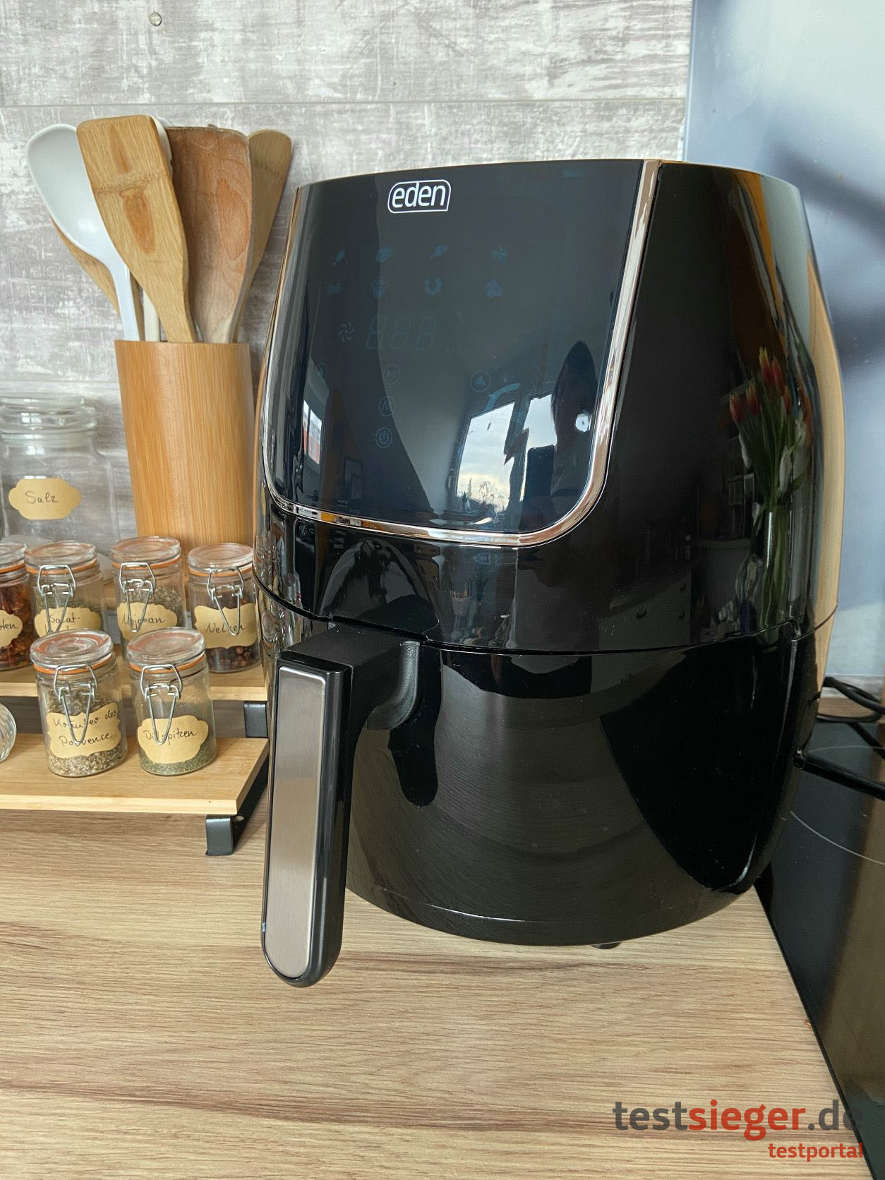 Im Großen und Ganzen ist die Eden ED-7012 Heißluftfritteuse eine Bereicherung für jeden Haushalt, insbesondere für Großfamilien. Mit einem Fassungsvermögen von 6 Litern können sehr große Portionen auf einmal zubereitet werden. Die 8 Automatikprogramme sind praktisch und bieten einen echten Mehrwert in der Zubereitung von Mahlzeiten. Die Verarbeitungsqualität geht in Ordnung, könnte an manchen Stellen aber sauberer sein. In Sachen Hitzebildung ist besonders am Frittierkorb Vorsicht geboten. Die fertigen Ergebnisse überzeugen uns jedoch vollkommen.