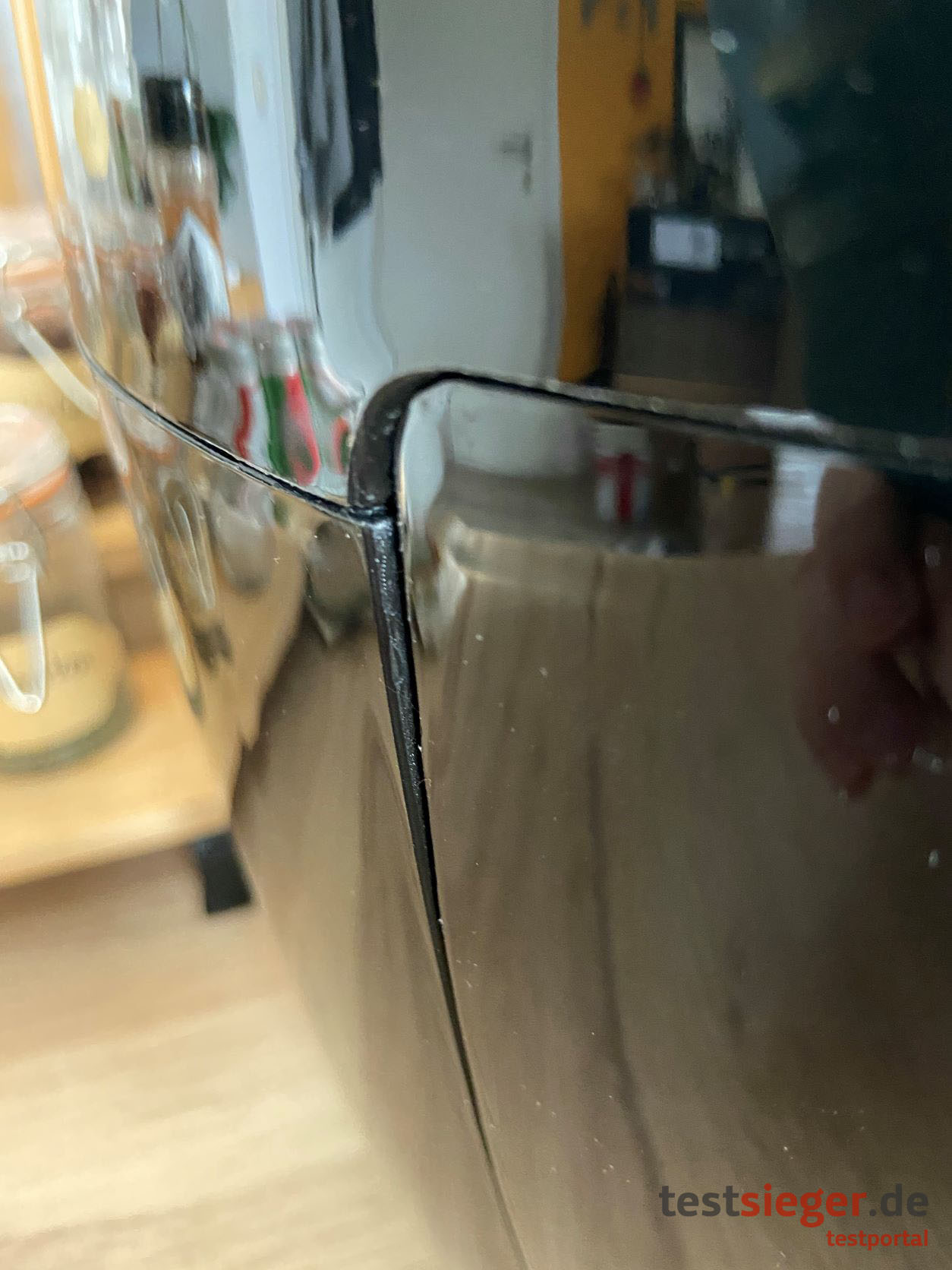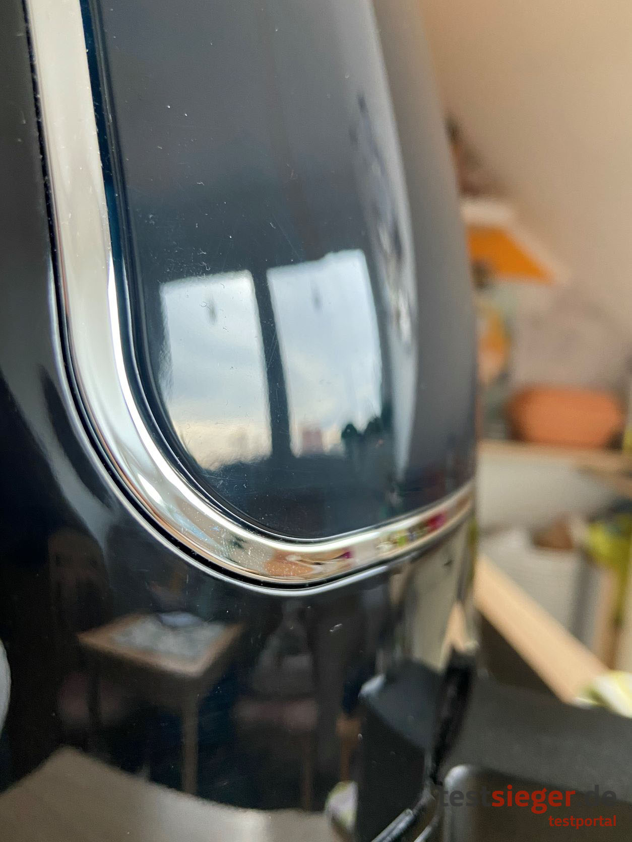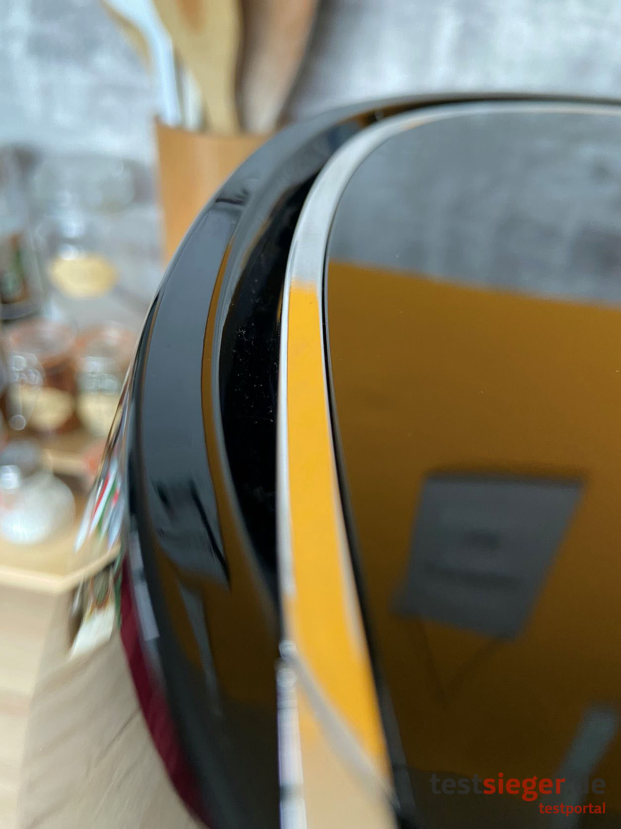 Bereits nach dem ersten Begutachten fallen uns ein paar Mängel in der Verarbeitung auf. So finden wir minimale Rückstände am Griff, aber auch größere Plastikfetzen am Frittierkorb. Dieser schließt außerdem nicht sauber mit dem Gehäuse, sondern steht an manchen Stellen über oder ist zu weit hineingeschoben. Hier spüren wir die unsauberen Übergänge und zum Teil auch scharfen Kanten. Zu große Spaltmaße finden wir am Rest des Geräts keine. Die Heißluftfritteuse von Eden besteht aus Kunststoff, dieser wirkt recht wertig. Es lassen sich keine Stellen eindrücken, die ED-7012 ist also sehr robust. Bei der Frittierplatte sollten Nutzerinnen und Nutzer jedoch auf zu hohen Kraftaufwand verzichten, denn sonst könnte das Gitter verbiegen. Der Korb und die Platte bestehen aus hochwertigem Metall und sind mit einer Antihaftbeschichtung ausgestattet.