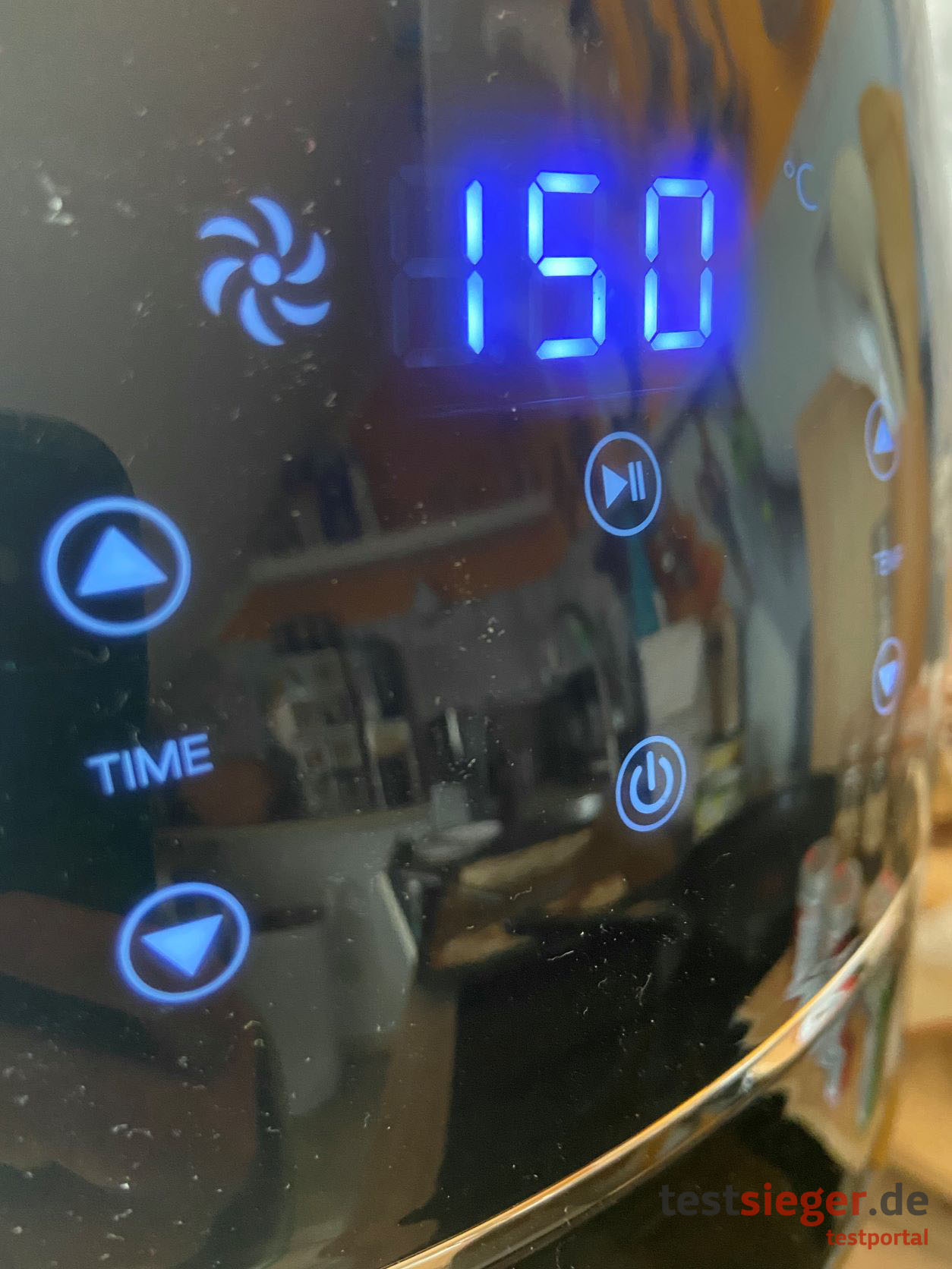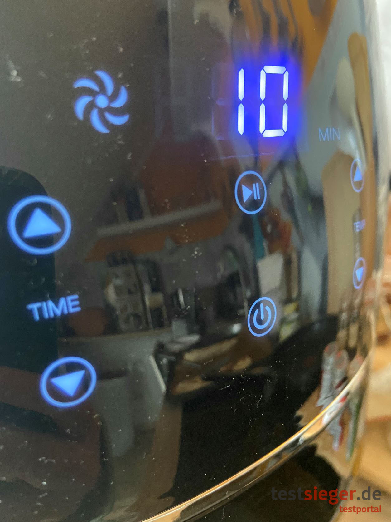 Wir starten unseren Frittiertest mit einer Portion tiefgefrorener Pommes frites. Die 750 Gramm Kartoffelsticks passen problemlos in den Frittierkorb. Das Stromkabel anschließen und schon leuchtet das Display mit blauen Elementen auf. Wir schieben den Korb in das Gerät zurück und schalten mit Tippen auf die Modus-Taste zum Pommes-Frites-Programm. Bei jedem Tippen ertönt ein Piepton, der aber nicht sehr laut ist. Sehr gut: Die Reaktionszeit der einzelnen Steuerungselemente ist sehr zügig, außerdem müssen wir nicht fest aufdrücken, damit der Befehl erkannt wird. Sobald wir das gewünschte Programm ausgewählt haben, tippen wir auf den Start-Stopp-Button und schon geht es los.