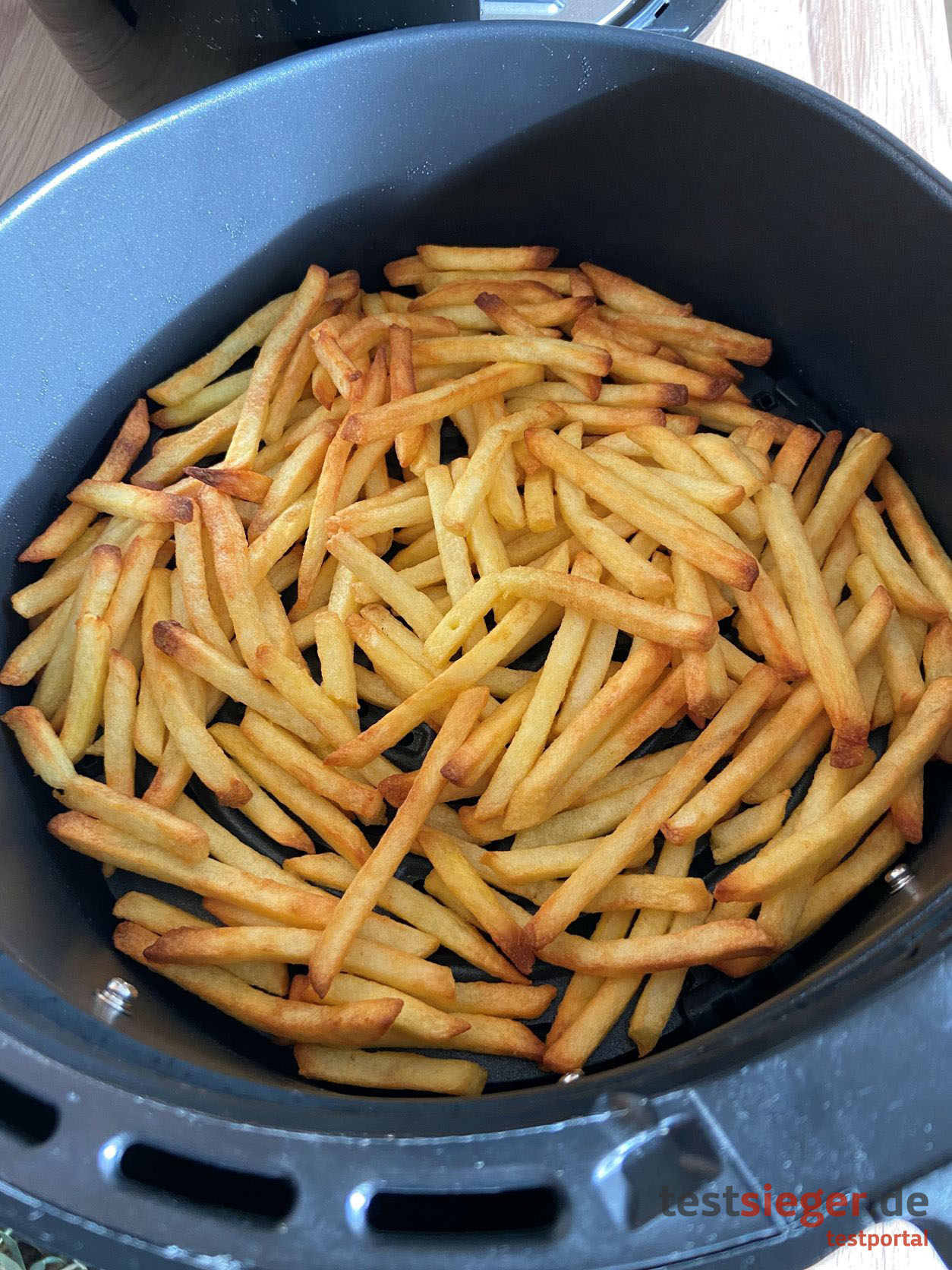 Das Programm setzt 20 Minuten bei 200 Grad Celsius an. Die Lautstärke der Fritteuse im Betrieb liegt in einem annehmbaren Bereich von 62 Dezibel (dBA). Eine Unterhaltung ist direkt neben dem Gerät also ohne Weiteres möglich. Nach der Hälfte der Zeit pausieren wir den Frittiervorgang manuell und wenden die Pommes frites. Hierbei fällt uns stark die Hitzebildung am Gehäuse auf. An den Seiten und der Rückseite ist das Gerät spürbar warm, aber vor allem am Frittierkorb selbst ist es fast schon heiß. Da der Frittierkorb nicht komplett sauber mit dem Gehäuse schließt, tritt an einer Stelle sogar Dampf aus. Hier hilft der feste Stand des Geräts, wodurch wir den Korb am kühlen Griff herausziehen, ohne das Gehäuse zu berühren. Wir wenden die Pommes durch vorsichtiges Schütteln und setzen den Korb wieder ein. Nachdem die Zeit abgelaufen ist, entnehmen wir die Pommes und sind sehr zufrieden mit dem Ergebnis. Die Sticks sind gleichmäßig gebräunt, außen schön kross und innen weich.