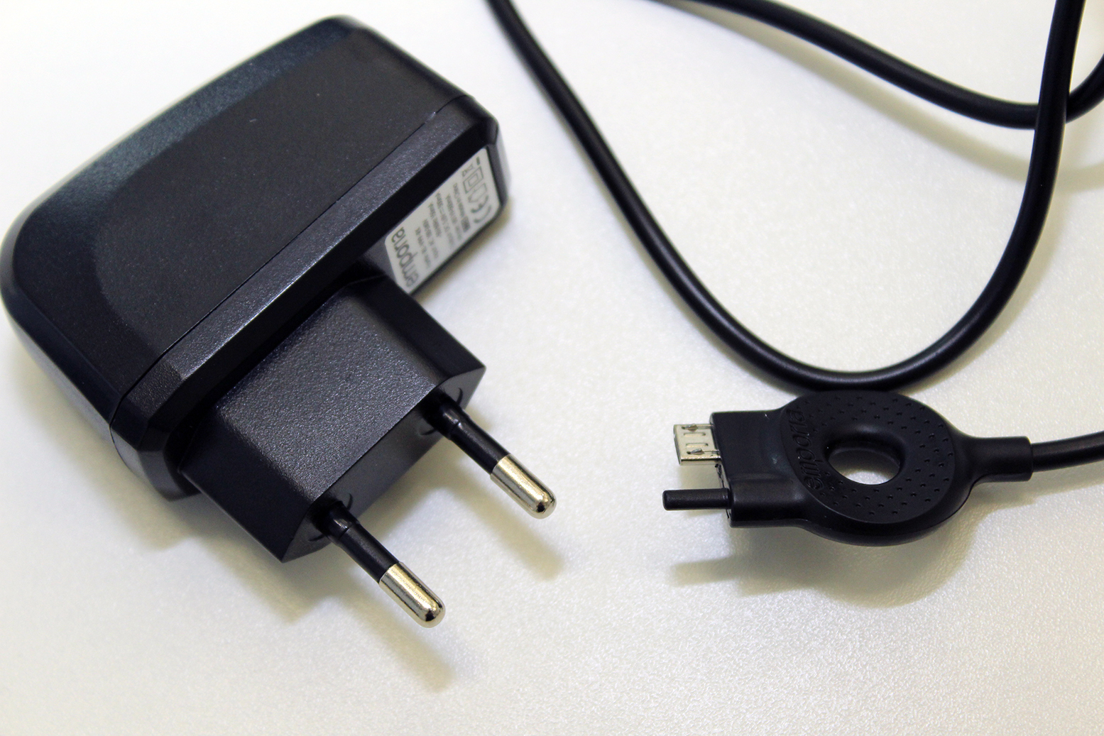 Unter der rückseitigen Abdeckung befindet sich der wechselbare Lithium-Ionen-Akku mit einer Kapazität von 1.100 mAh. Das entsprechende Ladekabel inklusive 5-Volt-USB-Netzteil ist im Lieferumfang enthalten. Der MicroUSB-Ladeanschluss unterscheidet sich jedoch von der klassischen Variante und ist am Ende mit einem kleinen Kunststoffstab versehen. Damit wird eine korrekte Verbindung sichergestellt, um Schäden an Stecker oder Anschluss vorzubeugen. Das MicroUSB-Kabel lässt sich auch mit der beiliegenden Ladestation verbinden. Die gummierte Unterseite bietet einen sicheren Halt.