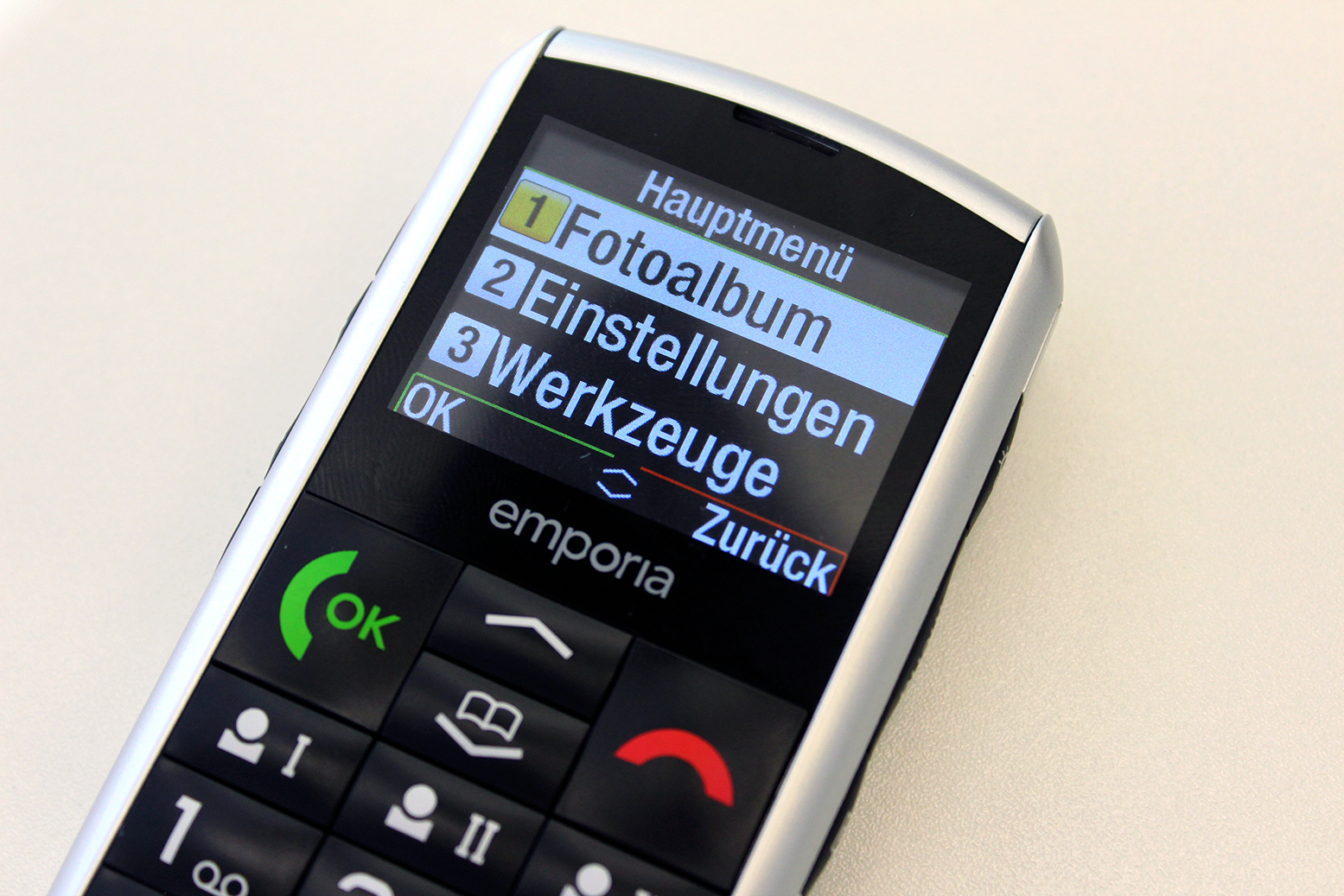 Zudem lässt sich hier das Menü über die entsprechende Taste öffnen. Dieses besteht aus sechs Überkategorien: Nachrichten, Fotoalbum, Werkzeuge, Kontakte, Anruflisten und Einstellungen. Die Menüs sind recht übersichtlich angeordnet und klar verständlich benannt. Sollten doch vereinzelte Verständnisprobleme auftauchen, kann einen Hilfetext zugeschaltet werden. Viele der Unterpunkte sind zu groß für das Display und laufen in behäbiger Laufschrift durch. Das ist gerade zu Beginn etwas störend, sobald man sich mit den unterschiedlichen Kategorien vertraut gemacht hat, fällt es nicht mehr ins Gewicht. Sinnvoll: Da den einzelnen Menüpunkten Nummern zugeordnet sind, lassen sie sich auch über die Wahltasten ansteuern.