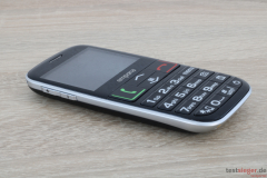 Apropos Tasten: Da es sich beim emporiaACTIVE um ein klassisches Handy handelt, befinden sich alle Knöpfe physisch auf der Frontseite – insgesamt 20 Stück. Sie reagieren zügig und überzeugen durch einen angenehmen Druckpunkt. Allerdings sind sie nicht gummiert und dadurch leicht rutschig, was die Haptik schmälert. Zudem hätten wir uns einen kleinen Abstand zwischen den Bedienelementen gewünscht. So ist das Erfühlen zwar trotzdem möglich, allerdings erschwert. Bei Dunkelheit hilft die praktische Tastenbeleuchtung weiter. Die zehn Wahltasten, die auch zur Texteingabe dienen, haben mit einer Breite von 1,2 Zentimetern und einer Höhe von 0,7 Zentimetern eine ordentliche Größe. Mit Abmessungen von 1,5 Zentimetern in Breite und Höhe sind die Rufannahme- und Rufablehntasten mit Abstand die größten Tasten. Schön: Neben den Wahltasten liegen noch drei Schnellwahlknöpfe für Menü, Kamera und Weckfunktion sowie der Power-Button.