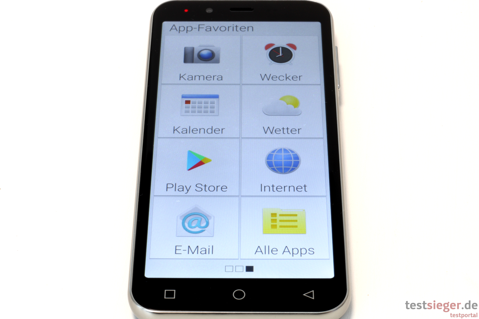 Am Design der emporia-App ändert der Hersteller nichts, schließlich hat sich diese bewährt. Sie punktet durch die aufgeräumte Struktur mit großen Tasten. Auf dem Starbildschirm finden sich beispielsweise vier Knöpfe mit einer Breite von 2,7 Zentimetern und eine Höhe von 2,5 Zentimetern. Standardmäßig sind diese mit der Telefon-App, der SMS-Funktion, der Bildergalerie und den Benachrichtigungen belegt. Die Buttons lassen sich jedoch auch individuell mit anderen Programmen oder Funktionen bestücken. Ein weiterer Screen bietet zusätzliche sieben weitere Tasten, die der Nutzer ebenfalls frei belegt. Über den Punkt „Alle Apps“ finden sich alle installierten Anwendungen. Da das SMART.4 Zugriff auf das komplette Angebot des Google Play Stores bietet, lässt sich die App-Auswahl nach Belieben erweitern. Praktisch: Ein eigener App-Installer listet eine Auswahl an bekannten Anwendungen wie WhatsApp oder Facebook auf. Hier muss der Nutzer also nicht unbedingt den App-Store durchforsten.