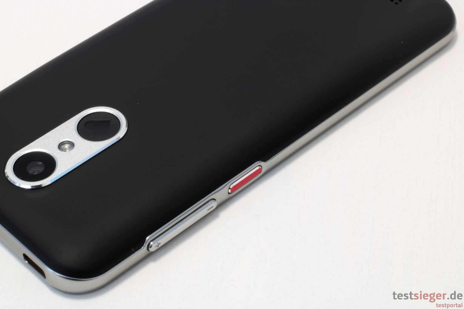 Eine weitere hilfreiche Funktion des SMART.4 ist die optionale Notruftaste. Wer diese nicht benötigt, verschließt sie einfach über die zweite beiliegende Rückabdeckung. Der Nutzer hinterlegt bis zu fünf Notrufkontakte, die das Telefon per Knopfdruck nacheinander anruft. Außerdem sendet es bei jedem Versuch eine SMS an den hinterlegten Kontakt. Ein lauter Alarm soll Menschen in der näheren Umgebung aufmerksam machen. Die Funktion überzeugt uns im Praxistest, wir stellen keine Aussetzer fest.