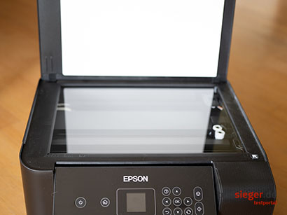 Der Scanner befindet sich unterhalb des Faxeinzugs. Wir klappen den Deckel hoch und können ihn nutzen. Über die Software Epson Scan Utility wird der Scanner wie gewohnt bedient. Die Einstellungen für die Auflösung, Vorschau und Scanbereich unterscheiden sich nicht von üblichen Scan-Anwendungen und funktionieren problemlos. Für einen einfachen Farbscan von 300 dpi benötigt der Epson ET-2720 etwa 30 Sekunden – bei einer Graustufenvorlage ist das Tempo mit etwa 14 Sekunden doch deutlich schneller. Die gemessenen Werte liegen absolut im Normbereich und nahe bei den Herstellerangaben von 28 Sekunden (Farbe) und 11 Sekunden (Graustufen).