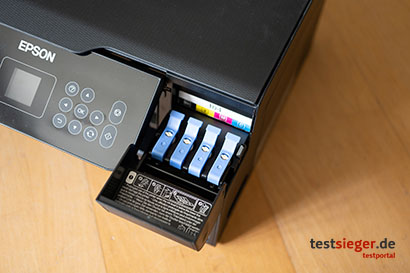 Der Epson EcoTank ET-2720 ist umfangreich ausgestattet. Drucken (maximale Auflösung: 5.760 x 1.440 dpi), scannen (maximale Auflösung: 1.200 x 2.400 dpi) und kopieren in einem Gerät klingen zunächst einmal sehr gut. Uns fällt bei der Auflösung auf, dass diese im Vergleich zum Epson EcoTank ET-5170 deutlich höher ist (4.800 x 1.200 dpi). Ob sich das im Druckergebnis positiv bemerkbar macht, bleibt abzuwarten. Das Alleinstellungsmerkmal der EcoTank-Serie ist jedoch das Drucksystem mit den nachfüllbaren Tintentanks. Der ET-2720 besitzt nicht wie gewöhnlich vier Druckpatronen, sondern jeweils einzelne Tanks für die Farben Cyan, Magenta, Yellow und Black. Vor der Ersteinrichtung füllen wir alle vier Tintentanks mit den jeweiligen Farben. Sehr positiv fällt auf, dass die entsprechend der Farbe gekennzeichneten Füllflaschen nur auf die dazugehörige Einfüllöffnung passen. Eine fehlerhafte Benutzung ist so nicht möglich. Allerdings ist die Reihenfolge der angeordneten Farben im Vergleich zu seinen Schwestermodellen genau umgekehrt, was uns zunächst etwas verwundert. Die im Lieferumfang enthaltene Tinte soll laut Herstellerangaben bis zu 4.500 Seiten Schwarz/Weiß und 7.500 Seiten in Farbe drucken. Das klingt vielversprechend und nach hoher Kosteneffizienz.