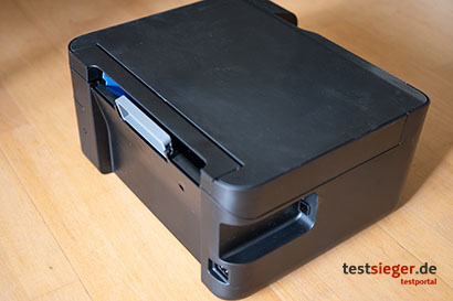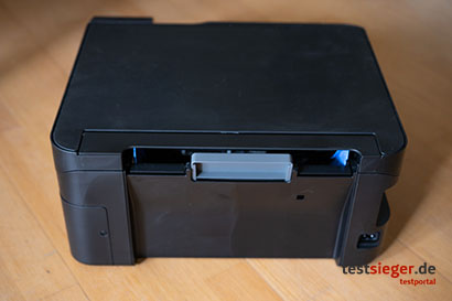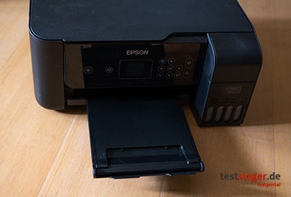 Der Multifunktionsdrucker verfügt über verschiedene Schnittstellen für die Datenübertragung. Neben einem kabelgebundenen Netzwerkanschluss (LAN) besitzt er auch ein WiFi-Modul – die klassische Verbindung per USB ist ebenfalls möglich. Für die einfache Bedienung des Geräts spendiert Epson dem ET-2720 ein LC-Farb-Display mit einer Bildschirmdiagonale von 3,7 Zentimetern. Es erweist sich aber gerade bei der Einrichtung manchmal als etwas zu klein und schlecht lesbar. An der Geräterückseite befindet sich eine 100 Seiten Normalpapier fassende Papierzufuhr. Der Drucker beherrscht zudem den Duplex-Druck.