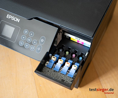 Die Inbetriebnahme ist aufgrund der Schritt-für-Schritt-Anleitung trotz der Komplexität des Druckers vergleichsweise einfach. Sowohl das kleine Handbuch als auch die umfangreiche Online-Anleitung auf der Hersteller-Website führen mustergültig durch die Erstinstallation. Selbst das Befüllen der Tintentanks ist kinderleicht. Es tropft und kleckert nichts daneben. Dazu klappen Nutzerinnen und Nutzer die Abdeckung direkt über die Tintentanks nach oben und öffnen den jeweiligen Verschluss der einzelnen Farben. Dann die gut sichtbar markierten Tintentanks bis zur obersten Markierung befüllen – fertig. Doch Vorsicht: Die Flasche nicht verkanten oder schräg ansetzen, sonst kann Tinte austreten.
